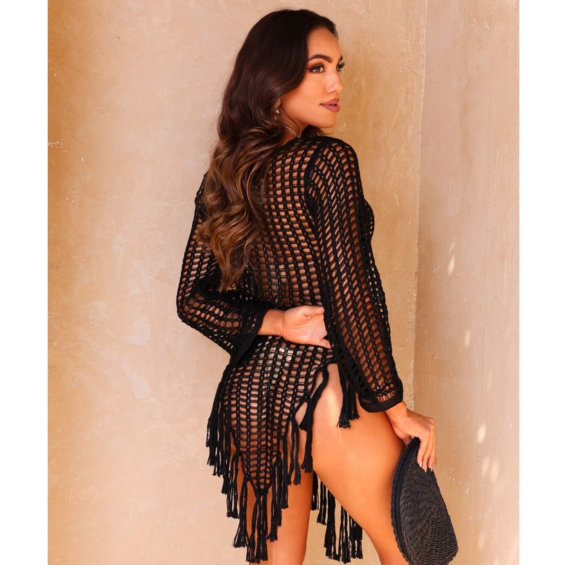 Vestido Saida de Praia Maresias Tricot Crochê Moda Praia Franjas Manga Longa