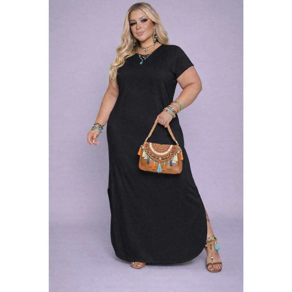 Vestido Saruel Plus Size Basic Feminino Longo Viscolycra Fendas Moda Elegante Verão Confortavel