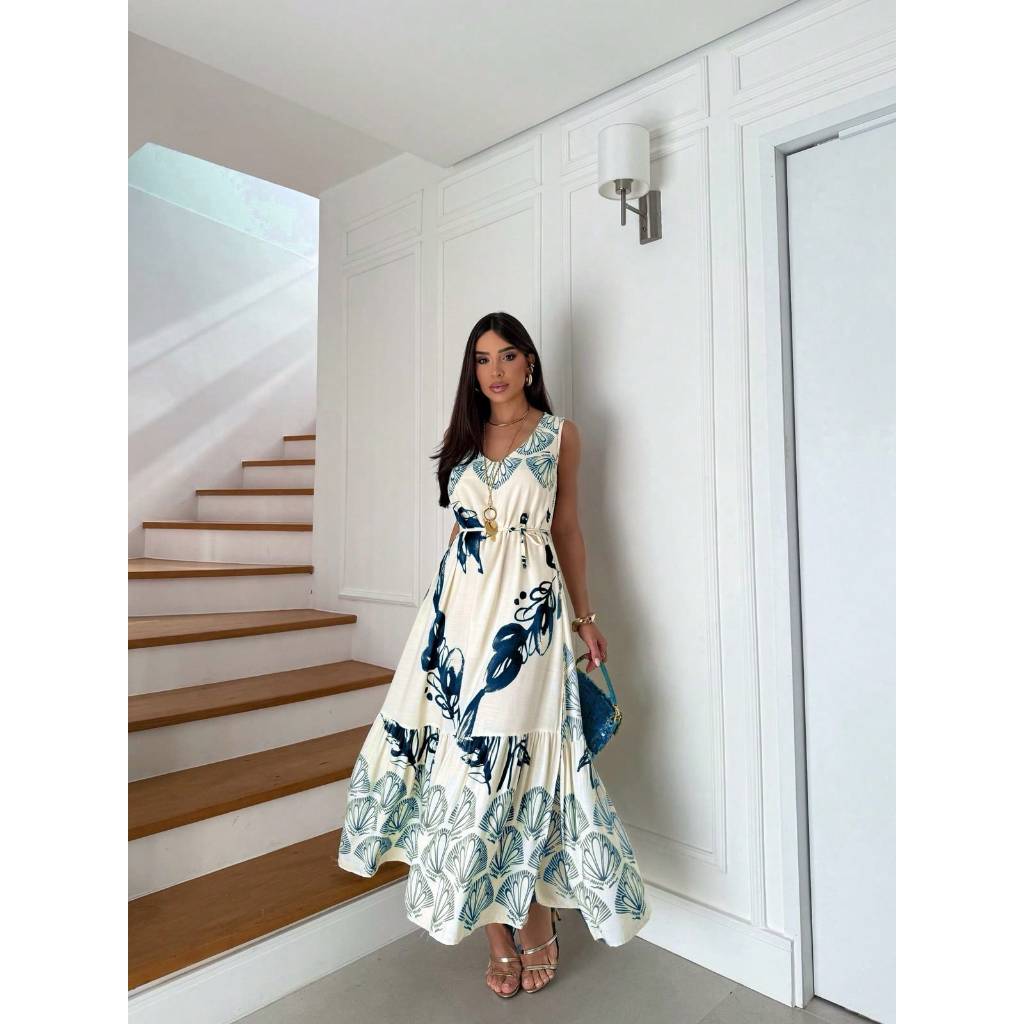 vestido sem manga soltinho com bolsa decote v estampado luxo com fenda 212 folha