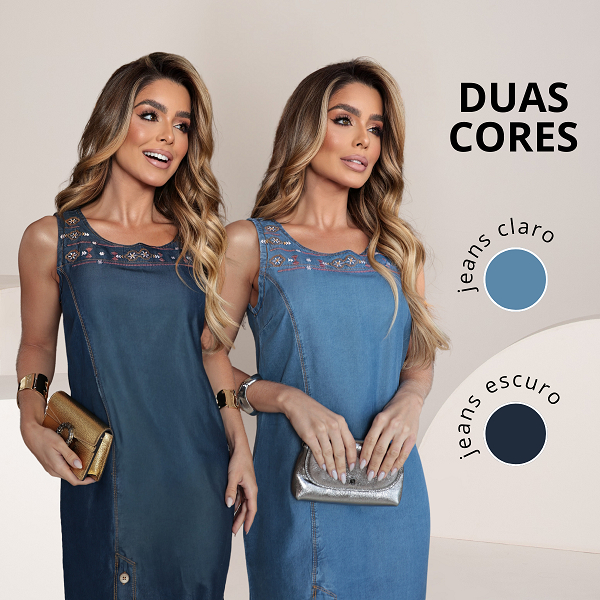 Vestido Soltinho Feminino Regata Jeans Tencel com Bordados 40590