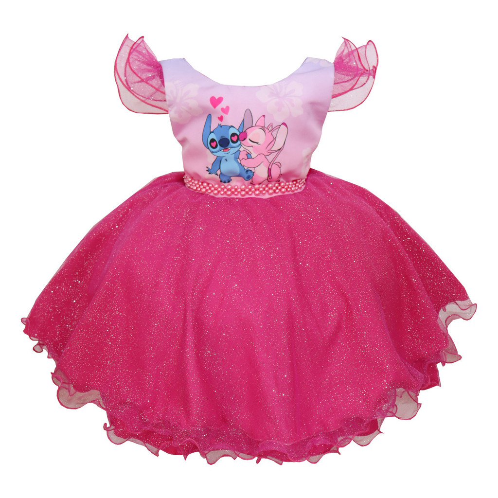 Vestido Stitch e Angel Lilo Apaixonado Rosa Pink Brilho Festa Aniversário Temático 1 ao 12 anos
