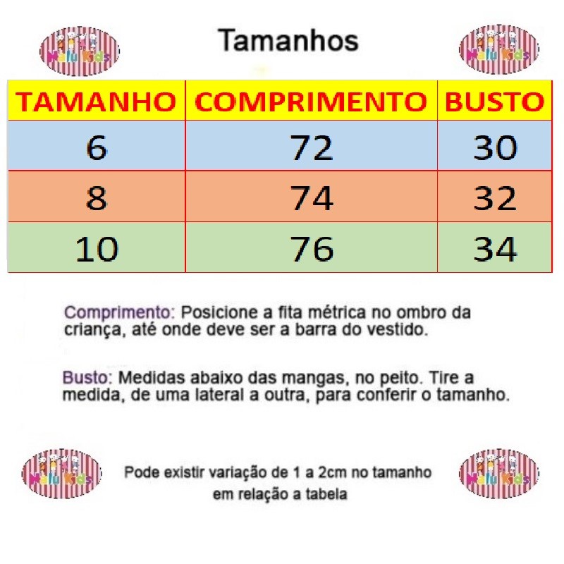 DESCRITIVO DO PRODUTO Bem vinda a nossa loja virtual , é um prazer estar aqui para atendê-la. Estamos à disposição para eventuais dúvidas, entre em contato que responderemos as suas perguntas. Os desenhos inseridos no tecido são de alta qualidade, com perfeito detalhamento do personagem. A qualidade do tecido é fundamental, por isso apostamos nos nossos produtos, que vem conquistando cada vez Mais clientes satisfeitos. ENVIAMOS EM MENOS DE 24 HORAS APÓS A CONFIRMAÇÃO DE PAGAMENTO PRONTA ENTREGA !!! PRODUTO DE ALTISSIMA QUALIDADE E ACABAMENTO EXCELENTE.. TECIDO: Tecido: Microfibra Acetinado 2 Forros : Filó(Tule) 100 % Algodão Laço da Frente : Removível Costas : Regulável , Lastex , ajusta-se perfeitamente . OBS : 1) Lembre-se que os tamanhos de crianças variam , com isso é importante informar todos os detalhes. 2) Quanto mais informação você passar , mais fácil será acertar o tamanho ideal do vestido. 3) 1 ou 2 cm pode variar no tamanho 4) Reservamo-nos no direito de alterar as informações aqui contidas a qualquer tempo 5) Alguma variação de cor pode ocorrer devido a iluminação local durante exposição das fotos ou vídeos.