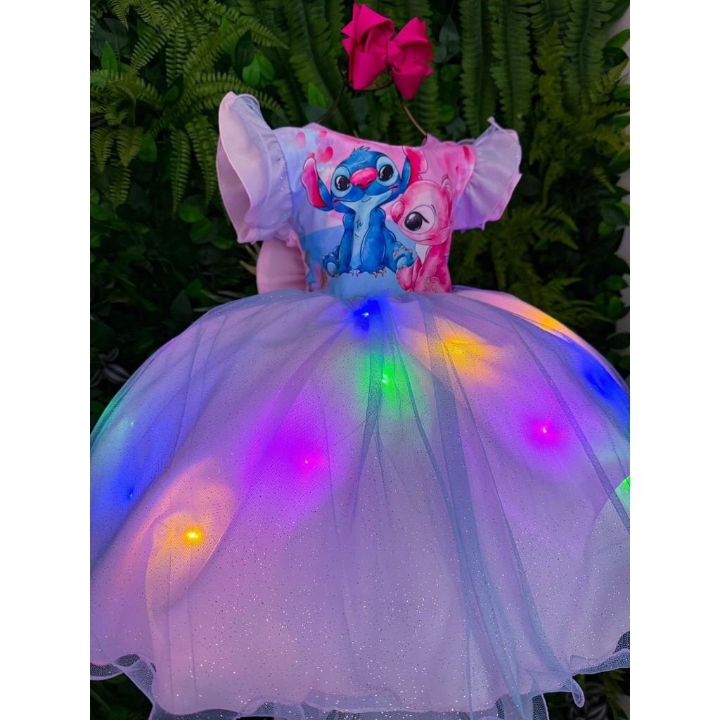 Vestido Temático Infantil Lilo Stitch e Angel Rosa Bebê com LED Festa Aniversário Luxo