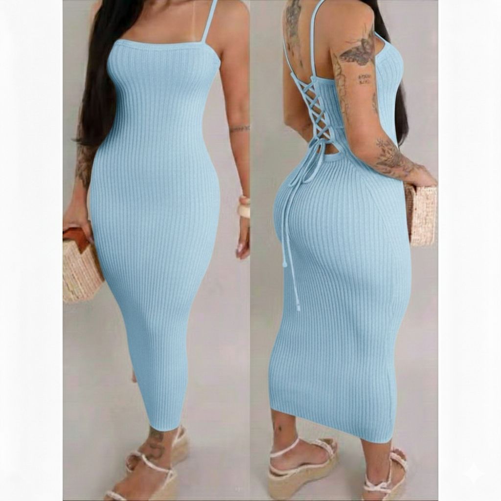 Vestido Trançado nas Costas Midi Tricot Modal Canelado tricô Tendência Verão