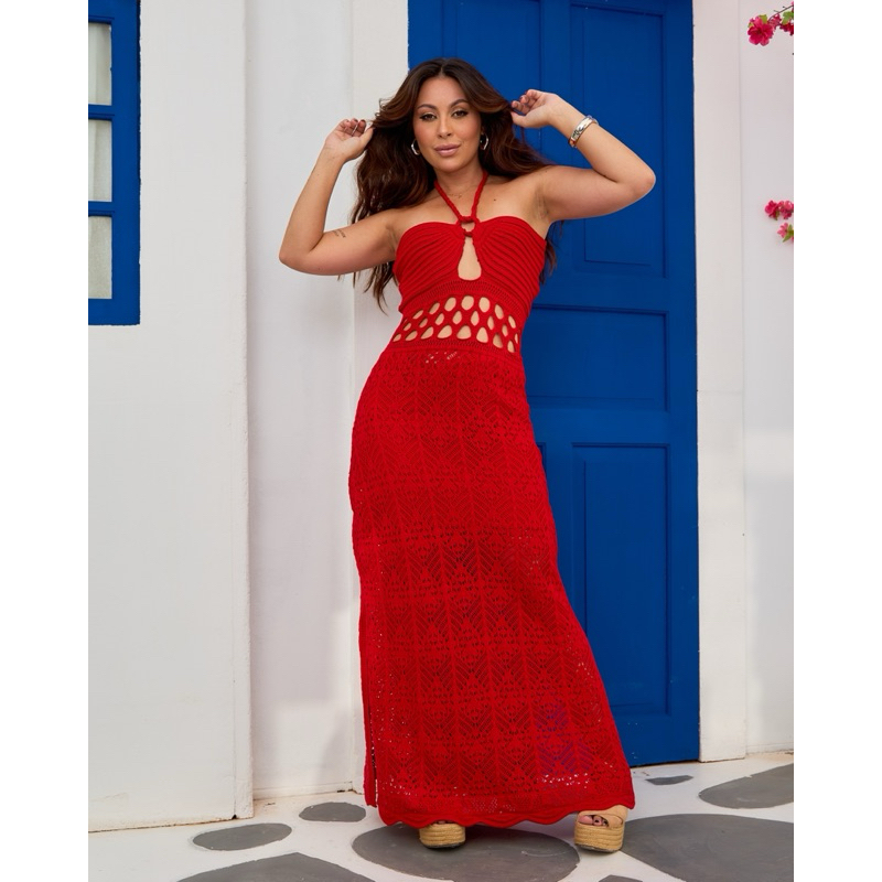 Vestido Ipanema Confeccionado no fio modal Tamanho M veste do 36 ao 42 MEDIDAS: Comprimento: 125cm Busto: 80cm circunferência Cintura: 52cm circunferência Vestido Longo Crochê Vermelho com Detalhes Vazados Aposte na elegância vibrante do vestido longo em crochê vermelho, uma peça que une sensualidade e sofisticação na medida certa. Com modelagem justa que valoriza as curvas, o modelo traz top estruturado tomara que caia com amarração no pescoço e recortes vazados na cintura, garantindo um toque moderno e ousado. O corpo da saia, todo em trabalho artesanal de crochê, cria um visual leve e delicado, perfeito para ocasiões especiais, festas à beira-mar ou eventos ao pôr do sol. O vermelho intenso adiciona poder e confiança, enquanto o caimento fluido e os detalhes feitos à mão destacam o cuidado e a exclusividade da peça. Destaques: -Tecido: Modal (com forro parcial) COMPOSIÇÃO: 48% acrílico 48% viscose 04% elastano - Modelo midi em crochê artesanal - Detalhes vazados na cintura - Decote com amarração no pescoço - Cor vibrante e elegante - Ideal para festas, resorts e ocasiões de verão DICA DE ESTILO: Combine com sandálias de plataforma, acessórios dourados e uma bolsa de palha para um look sofisticado e moderno. **CUIDADOS DE USO: O tricot é uma peça delicada, siga as instruções de uso e lavagem para aumentar sua durabilidade. - De preferência a lavagem á mão - Não alvejar - Não secar em tambor - Não torcer a mão, apenas pressione para tirar o excesso de água - Não pendure a peça no varal verticalmente. o peso da água pode danificar sua peça. - Passar a ferro até 110° C - Limpeza a seco profissional - Não pendure sua peça em cabides, guarde sempre dobradas.