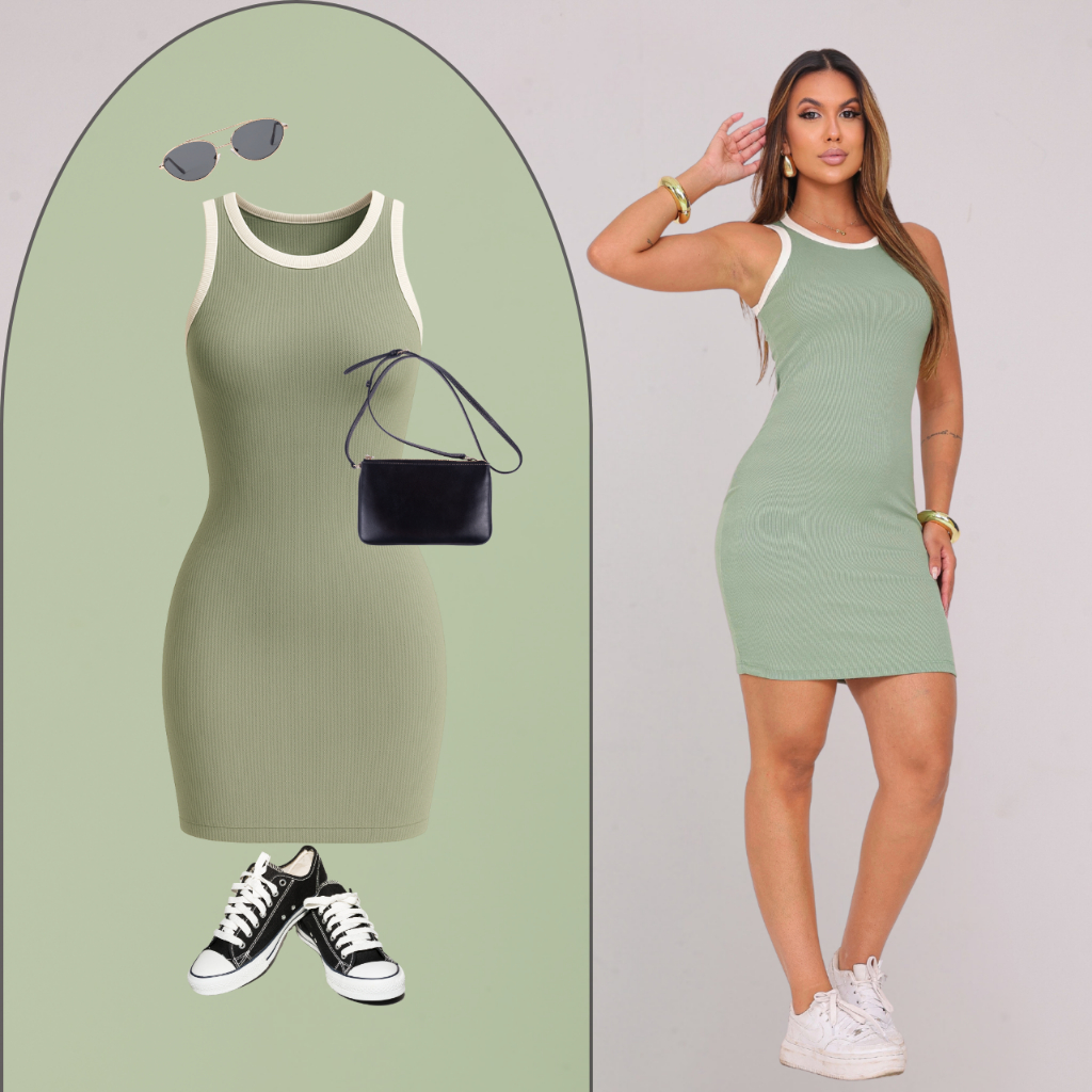 Vestido Tubinho Curto Regata Canelado Premium Bicolor Moda Casual Elegante Verão