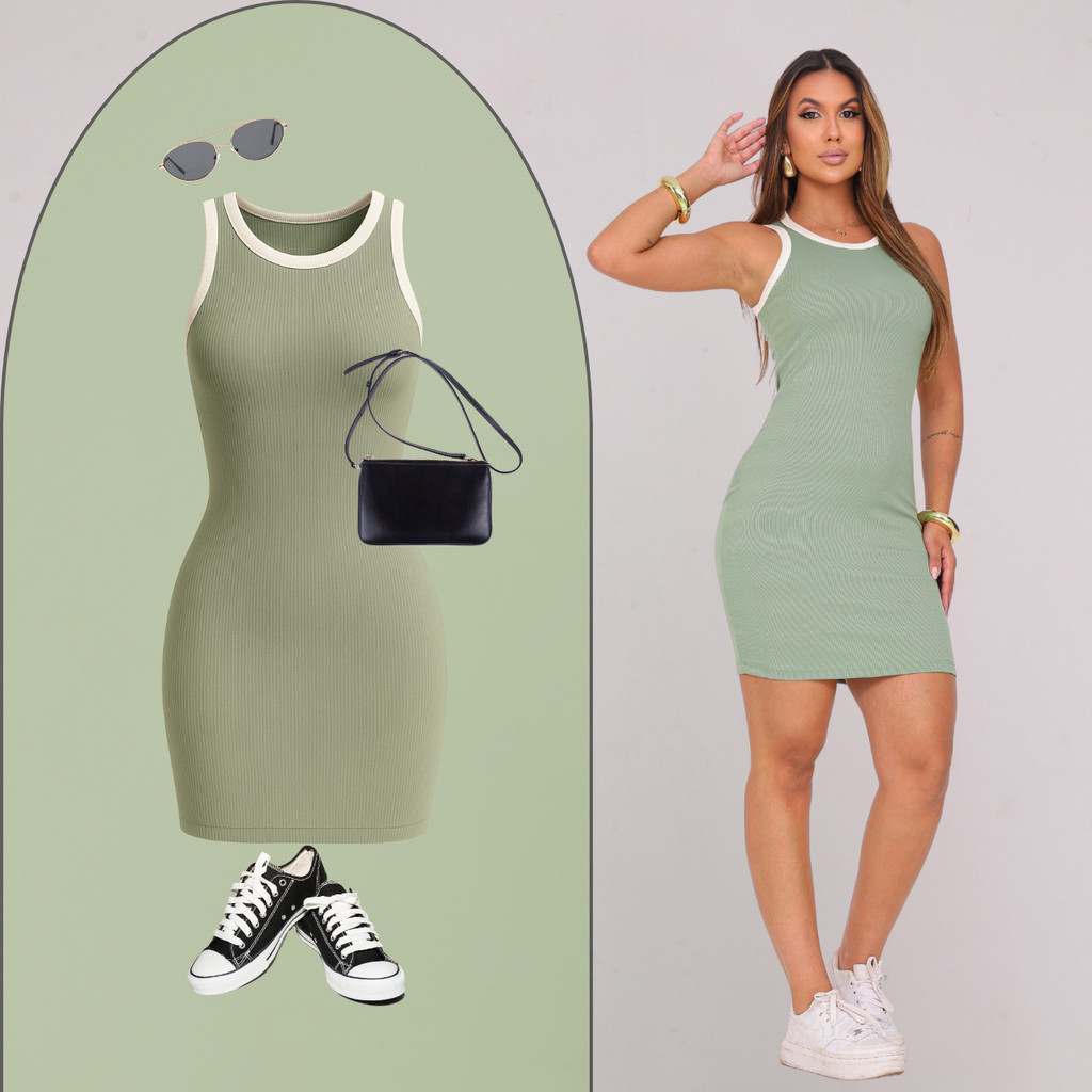 Vestido Tubinho Feminino Bicolor Regata Cavado Canelado Premium Moda Casual Elegante