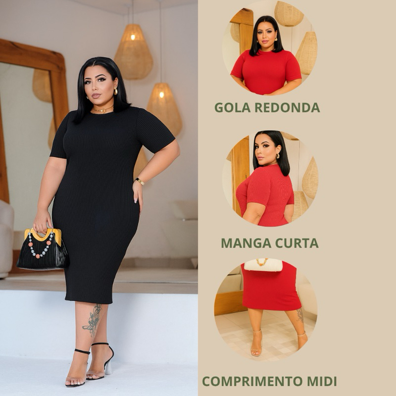 Vestido Tubinho Plus Size Canelado Grosso Premium Elegante Feminino com manga Cores da Moda do Trabalho a Balada Até G2
