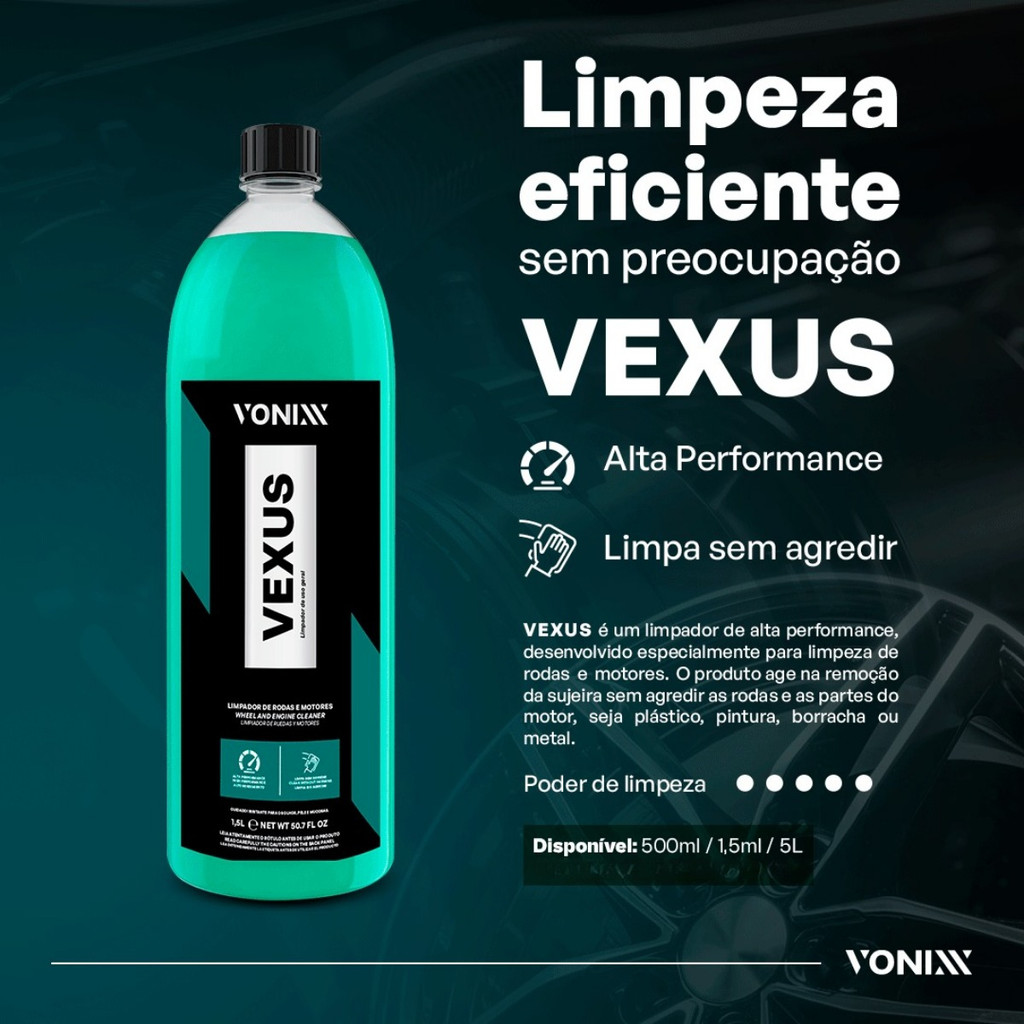1 - LIMPADOR RODAS E MOTOR VEXUS 1,5L VONIXXDESCRIÇÃO:Vexus é um limpador de alta performance, desenvolvido especialmente para limpeza de rodas e motores. O produto age na remoção da sujeira sem agredir as rodas e as partes do motor, seja plástico, pintura, borracha ou metal.MODO DE USO:1- Pulverize uma pequena quantidade de produto na superfície fria.2- Com o auxílio de escova ou pincel, faça a esfregação até notar o desprendimento da sujeira.3- Utilizando um jato d’água faça o enxágue por completo e em seguida a secagem.