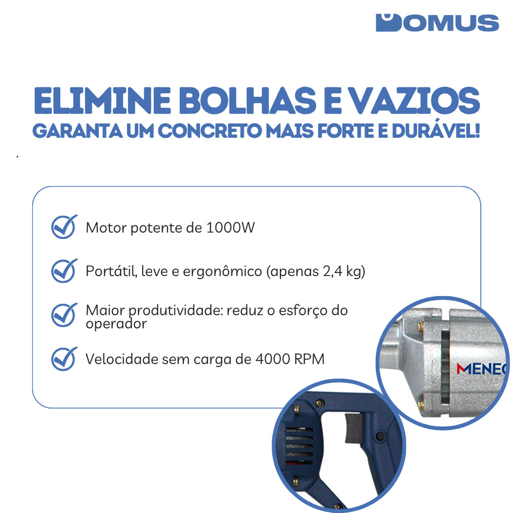 ***PRODUTO A PRONTA ENTREGA COM ENVIO IMEDIATO*** ITEM ORIGINAL COM NOTA FISCAL Somos a Domus, Loja oficial da Shopee. Temos 5 anos de experiência em E-Commerce e nosso maior objetivo é garantir a satisfação dos nossos clientes! O Vibrador de Imersão Portátil Menegotti é a escolha ideal para quem busca alto desempenho, praticidade e qualidade no adensamento do concreto. Compacto, leve e de fácil transporte, proporciona excelente ergonomia, reduzindo o esforço do operador e aumentando a produtividade. Perfeito para garantir um concreto mais resistente, livre de bolhas e com excelente acabamento, o equipamento transmite a vibração através do mangote conectado ao motor, oferecendo eficiência máxima na compactação do concreto. Motor robusto com 1000W de potência Informações técnicas: Tensão: 127V ou 220V – Monofásico Frequência: 50/60Hz Potência: 1000W Velocidade sem carga: 4000 RPM Peso do motor: 2,4 kg Modelos de mangote compatíveis (vendidos separadamente): Ø28 mm x 1,2 m Ø28 mm x 2,5 m Ø35 mm x 1,2 m Ø35 mm x 2,5 m Qualidade, resistência e desempenho para sua obra. Garanta já o seu!