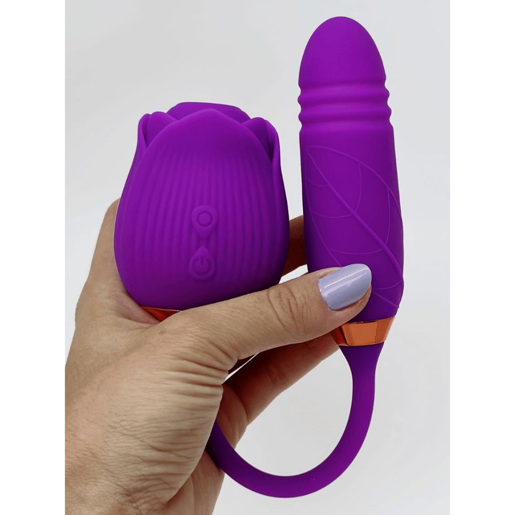 Vibrador Formato de rosa, com Pulsador de Clitoris, e com Penetracao vai e vem