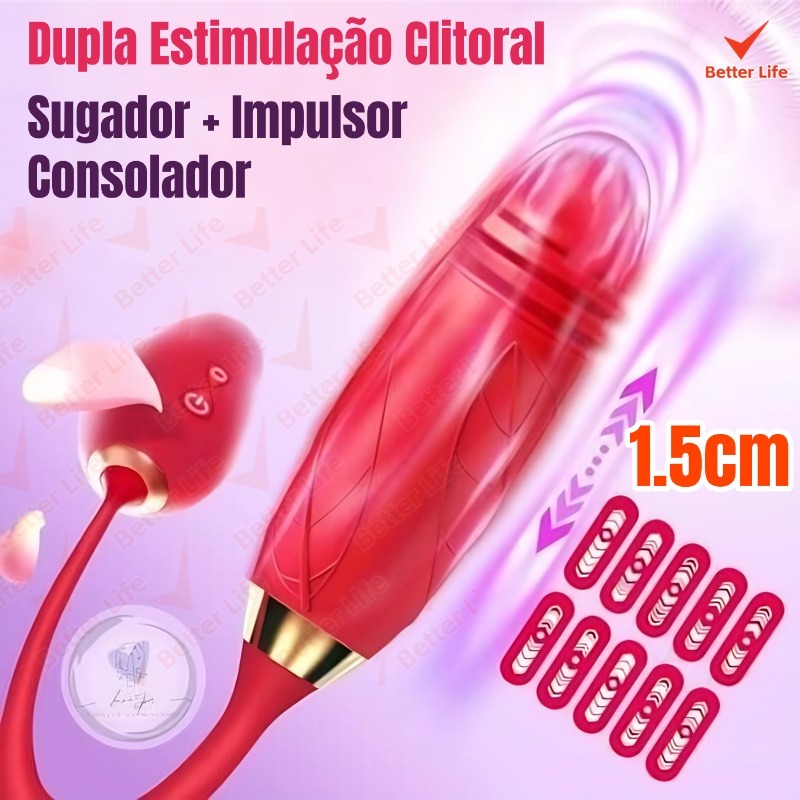 Vibrador Rosa Sugador de Clitoris com Vibrador vai e vem, Clitóris Vagina e Anal Recarregável-BT