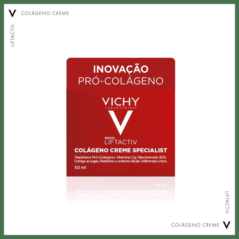 Creme antissinais para o rosto. Vichy Liftactiv Colágeno Creme Specialist recupera a firmeza e a jovialidade da pele, com muita eficácia. O Creme Antissinais Vichy Liftactiv Colágeno Creme Specialist apresenta uma nova combinação de ingredientes, que inclui a Água Vulcânica Vichy junto com um concentrado de ativos dermatológicos, tais como os Peptídeos Colágeno Specialist, Vitamina CG e Niacinamida (Vitamina B3). Essa fórmula poderosa foi especialmente desenvolvida para promover a firmeza da pele, melhorar a uniformidade do tom, reduzir a flacidez e minimizar a aparência de rugas visíveis. Os resultados desse creme são clinicamente comprovados e se manifestam com o uso contínuo. Além disso, proporciona 48 horas de hidratação intensa, auxiliando na nutrição e revitalização da pele. Como Usar: Aplicar uma ou duas vezes ao dia após seu sérum usual. Evitar o contorno dos olhos. **** IMPORTANTE: Não vendemos para contas CNPJ, evite que seu pedido seja cancelado! ****