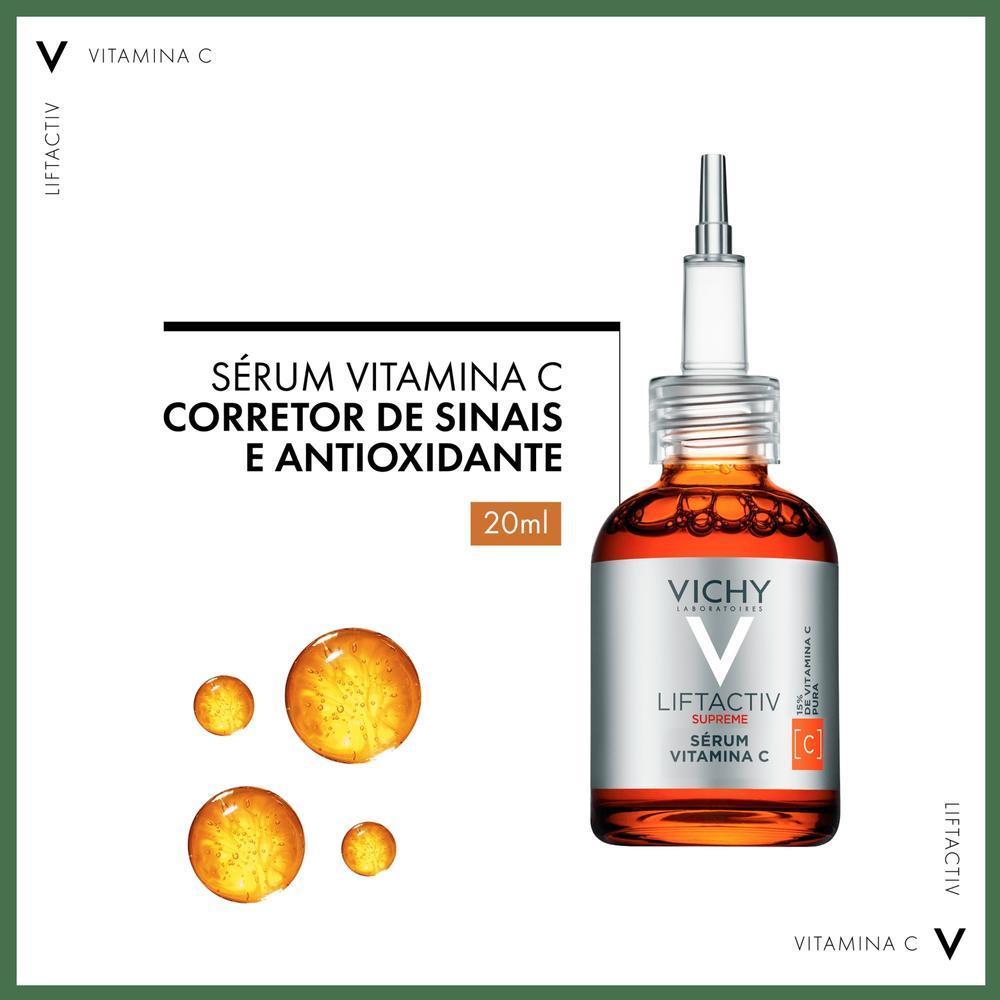 Sérum facial. Vichy Liftactiv Vitamina C é um antioxidante que previne os sinais da idade causados pelos estresses do dia a dia. Descubra o poder de Vichy Liftactiv Supreme com o Sérum Vitamina C. Desenvolvido para todos que buscam prevenir os sinais da idade e combater os estresses do dia a dia, este sérum é o seu novo aliado para uma pele visivelmente mais saudável e luminosa. Este sérum atua diretamente no combate aos danos causados por radicais livres, prevenindo o envelhecimento precoce da pele. Sua fórmula inovadora combina a mais alta concentração de 15% de Vitamina C pura com ativos como Vitamina E, Picnogenol e Ácido Hialurônico puro. Essa sinergia poderosa garante uma pele mais firme, com linhas finas e rugas suavizadas, além de corrigir o tom irregular. Os resultados são clinicamente comprovados: Em apenas 10 dias, a pele ganha mais luminosidade e, com o uso contínuo, torna-se visivelmente mais uniforme, radiante e rejuvenescida, com eficácia e segurança dermatológica. Benefícios do Sérum Liftactiv Supreme Vitamina C: ▸ Sérum antioxidante que previne os sinais da idade, com uma fórmula inovadora que rende mais e age profundamente.▸ Com 15% de Vitamina C pura, Extrato de Pinus Pinaster e Neohesperidina para uma potente ação contra radicais livres.▸ Sua ação corretora de sinais resulta em uma pele com mais firmeza e com linhas finas visivelmente reduzidas.▸ Resultados rápidos e duradouros, com uma pele com +40% de luminosidade e +51% de uniformidade em um mês de uso.▸ Conquiste uma pele radiante, uniforme e rejuvenescida com a eficácia dermatológica comprovada de Vichy Liftactiv Supreme. Ingredientes principais: - Vitamina C pura- Vitamina E- Picnogenol- Ácido Hialurônico puro Adicione o poder antioxidante do Sérum Liftactiv Supreme Vitamina C à sua rotina e revele uma pele mais jovem e iluminada. **** IMPORTANTE: Não vendemos para contas CNPJ, evite que seu pedido seja cancelado! ****