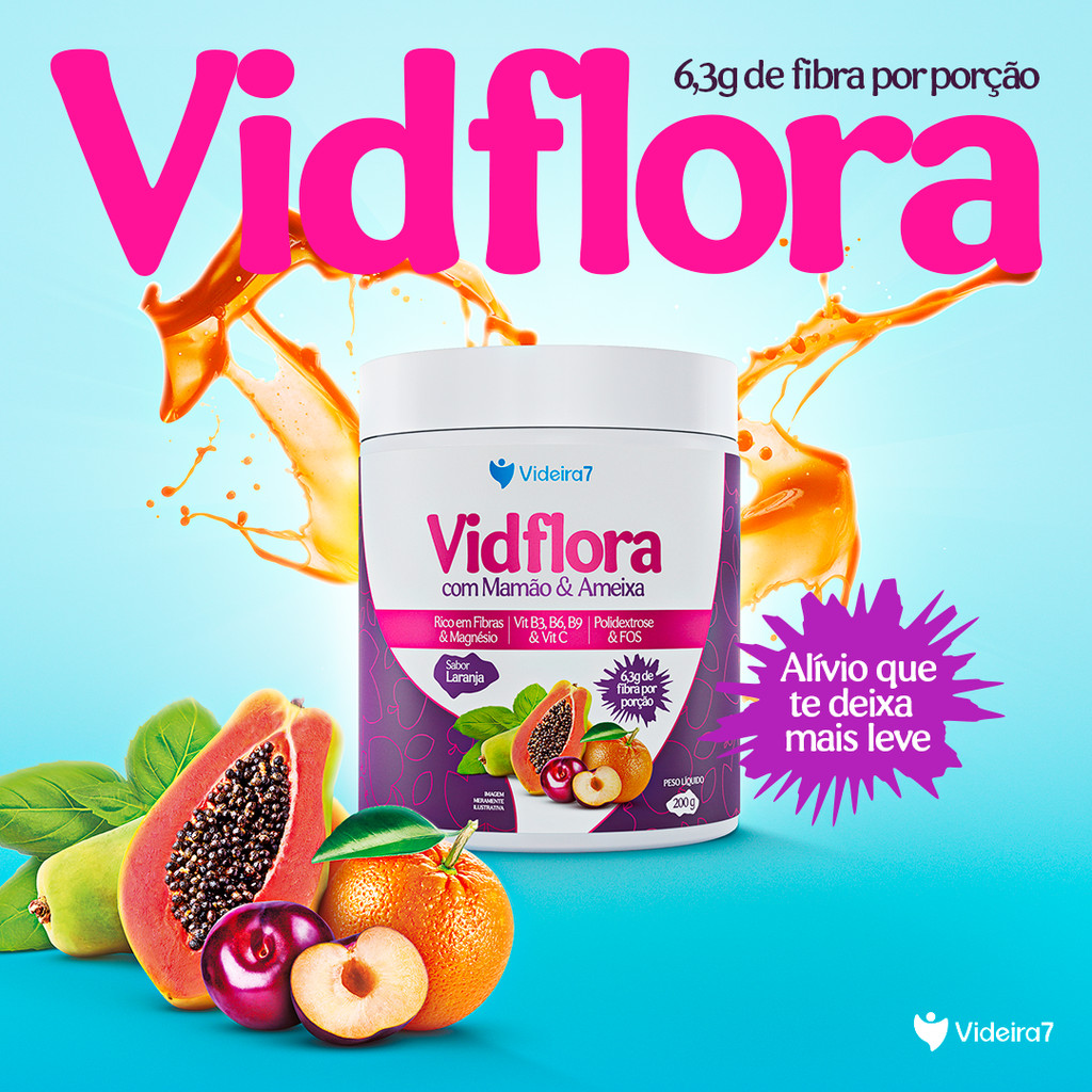 O VidFlora é um suplemento alimentar em pó desenvolvido para auxiliar no funcionamento intestinal. Sua fórmula combina fibras alimentares com vitaminas essenciais e minerais, proporcionando benefícios para a saúde digestiva e o bem-estar geral. Benefícios: ✅ Auxilia no funcionamento do intestino ✅ Contribui para o metabolismo energético ✅ Rico em fibras alimentares ✅ Contém vitaminas B2, B6, B9 e C ✅ Fonte de magnésio ✅ Sabor agradável de mamão e ameixa ℹ️ Ficha Técnica: ✅ Produto: Suplemento alimentar de fibras e vitaminas em pó ✅ Sabor: Mamão e Ameixa ✅ Peso líquido: 200g ✅ Ingredientes: Polidextrose, ameixa desidratada em pó, mamão desidratado em pó, frutooligossacarídeos, riboflavina (vitamina B2), nicotinamida (vitamina B3), cloridrato de piridoxina (vitamina B6), ácido fólico (vitamina B9), dimalato de magnésio, ácido ascórbico (vitamina C), edulcorante sucralose, acidulante ácido cítrico (INS 330), antiumectante fosfato tricálcico (INS 341iii), aromatizante e corante ✅ Sugestão de uso: Adicione 2 dosadores a 200ml de água filtrada e mexa até completa dissolução ✅ Não contém glúten ✅ Marca: Videira 7 ✅ Embalagem: Pote plástico com tampa rosqueável