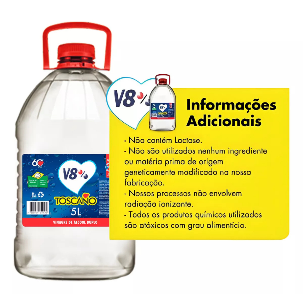 VINAGRE DE ÁLCOOL 8% TOSCANO 5 LITROS Vinagre de álcool com a maior contração do mercado; Ideal para higienização de alimentos e limpeza da casa; NÃO CONTÉM GLUTEN. EMBALAGEM: 5L. Contém: 1 Vinagre de Álcool 8% de acidez Toscano 5L.