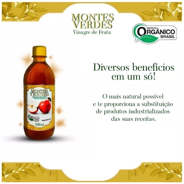 Vinagre de Maça Organico Montes Verdes Muito além do tempero! O único que contém a mãe do vinagre! MONTES VERDES é um vinagre vivo de maçã, 100% natural, cru, encorpado, nobre, de alta qualidade. Trata-se de um vinagre fabricado artesanalmente. Ele traz da maçã toda a sua rica gama de nutrientes e ácidos orgânicos fundamentais. Contém mais de 300 compostos essenciais conhecidos. É obtido através do esmagamento da maçã in natura. O suco assim obtido sofre duas fermentações naturais consecutivas que lhe permite manter suas extraordinárias qualidades vitais para a saúde. Altamente aromatizado e perfumado atende os mais refinados paladares da boa cozinha. O verdadeiro vinagre vivo de maçã é aquele que tem predominante sua cor dourada, é saudável, possui depósitos ou residuos resultantes de fermentação acética natural de maçãs frescas amadurecidas pela natureza, com acidez mínima de 5%. O consumo do vinagre vivo de maçã fortalece o sistema imunológico, previne cálculos na bexiga e infecções do trato urinário, equilibra o Ph do organismo, trata o mau hálito e ajuda a diminuir o peso, uma vez que contribui para a dissolução de gorduras. INGREDIENTES: Fermentado aético de maçã orgânico e água. Como usar o vinagre de maçã Montes Verdes o vinagre de maçã Montes Verdes possui probióticos e é produzido também PARA BEBER Em um copo, coloque uma colher de sopa de vinagre de maçã, complete com água e mexa bem, até misturar. Tome antes das principais refeições (3 x ao dia). O vinagre de maçã também pode ser tomado com mel, canela, gengibre, açafrão, e outras especiarias de sua preferência. Também pode ser usado puro, como tempero em saladas e carnes. Também pode ser tomado como pré-treino e antes de dormir. O tempo necessário é de 3 a 4 meses para atuação maravilhosa do Vinagre Vivo de Maçã, porém, já nas primeiras semanas começará a sentir uma grande disposição física! PRINCIPAIS BENEFÍCIOS DO VINAGRE DE MAÇÃ (segundo médicos e nutricionistas) • Diminui a taxa de glicose no sangue, e a pectina da maçã diminui a absorção de gorduras; • Aumenta a imunidade, pois estimula a fabricação e o funcionamento dos glóbulos brancos; • Possui ação digestiva, contribuindo para a diminuição da gordura corporal, auxiliando na redução de peso e celulites; • Diminuição da sensação de fome; • Fonte de vitaminas, enzimas, ácidos orgânicos, antioxidantes, ferro e fibras, que contribuem para o funcionamento do intestino; • Combate os radicais livres; • Promoção do rejuvenescimento da pele e dos cabelos; • Auxilia o controle da pressão arterial, colesterol, catarata, ácido úrico, e pré-diabetes; • Age como um antibiótico natural e limpa a garganta; • Auxilia na prevenção do Alzheimer;