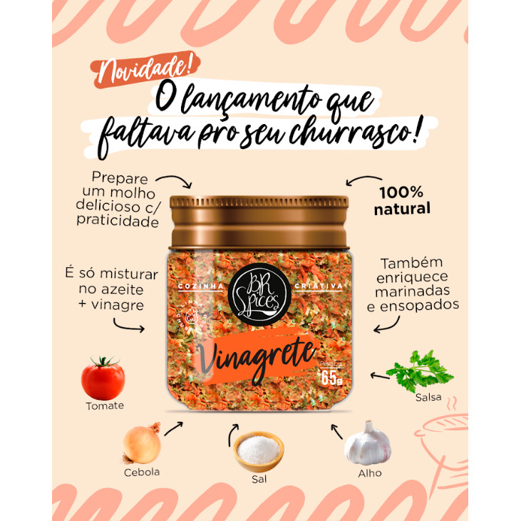 Apresentamos nosso extraordinário Vinagrete Seco, a solução perfeita para elevar seu churrasco e o sabor do seu dia a dia. Por ser a união dos sabores do vinagrete fresco de forma desidratada, em apenas alguns instantes, você desfrutará de um molho irresistivelmente delicioso e suculento. INGREDIENTES Tomate, Cebola, Sal Marinho Iodado, Alho e Salsa INFORMAÇÕES SOBRE O PRODUTO Sem Glúten 0% glutamato Sem conservantes Sem corantes Ingredientes 100% naturais Pote Pet - Tampa Alumínio QUER DESCOBRIR DICAS DE OURO DO NOSSO CHEF FUNDADOR? Você sabia que o calor e a umidade são inimigos de temperos 100% naturais e puros? Por isso, aqui na BR Spices recomendamos que armazene as embalagens em local fresco e livre de umidade. COMBINA COM Carne, frango, pão, salada CONHEÇA A BR SPICES Somos uma empresa jovem que nasce de uma cozinha moderna e acessível. Carregamos em nosso DNA a criatividade, alegria e o espírito empreendedor brasileiro. Boa cozinha para nós é a cozinha criativa, seja um prato prático e saudável para o dia a dia ou uma receita de domingo que faz viajar no tempo e na memória.