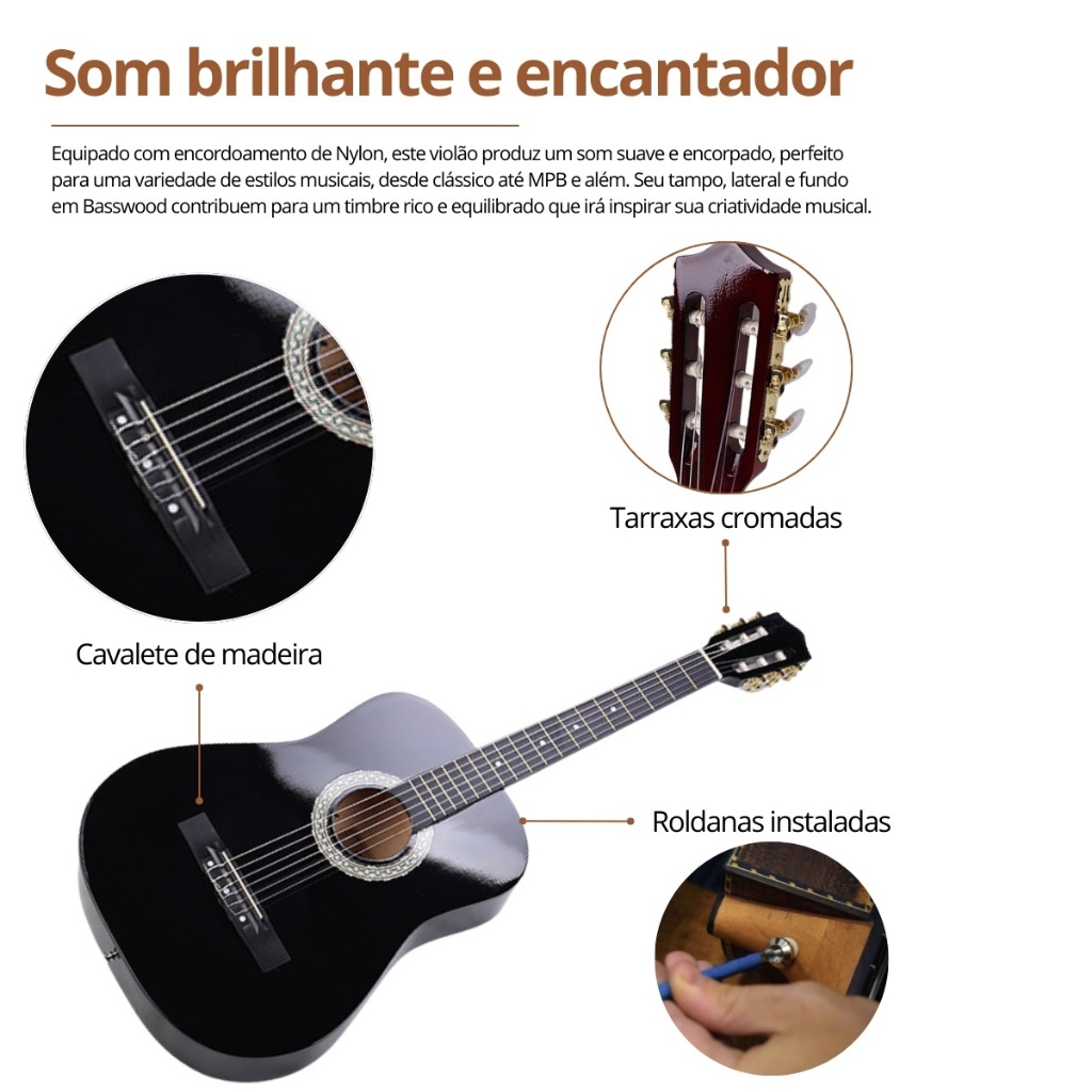 Explore sua paixão pela música com o Violão Bravo Acústico! Se você está começando sua jornada musical ou busca aperfeiçoar suas habilidades, o Violão Bravo Acústico é o parceiro perfeito para você. Projetado para oferecer qualidade excepcional e conforto, este violão é o seu bilhete de entrada para o mundo da música. Design e Conforto: Com um tamanho clássico adulto de 38 polegadas, o Violão Bravo proporciona uma experiência confortável e envolvente para os músicos de todas as idades. Seu design ergonômico e acabamento em verniz brilhante não apenas garantem uma aparência elegante, mas também uma sensação agradável ao tocar. Som Encantador: Equipado com encordoamento de Nylon, este violão produz um som suave e encorpado, perfeito para uma variedade de estilos musicais, desde clássico até MPB e além. Seu tampo, lateral e fundo em Basswood contribuem para um timbre rico e equilibrado que irá inspirar sua criatividade musical. Durabilidade e Confiabilidade: Construído com materiais de alta qualidade, o Violão Bravo Acústico é projetado para resistir ao teste do tempo. Seus trastes bem posicionados e tarraxas cromadas garantem uma afinação precisa e estável, permitindo que você se concentre no que mais importa - sua música. Escolha sua Cor, Faça sua Música: Disponível em uma variedade de cores vibrantes - Preto, Azul, Natural e Natural Escuro - o Violão Bravo permite que você escolha o estilo que mais combina com sua personalidade e expressão artística. Não espere mais para começar sua jornada musical. Adquira agora o Violão Bravo Acústico e deixe sua criatividade fluir! Especificações: Tamanho: Clássico (adulto) Tamanho: 7/8 (38 polegadas) Altura: 96cm Indicação: a partir de 10 anos Tampo: Basswood Lateral e fundo: Basswood Trastes: 18 Encordoamento: Nylon Tarraxas: Cromadas Cavalete: Plástico 1 cm Acabamento: Verniz Brilhante Produto original com garantia em todo Brasil.