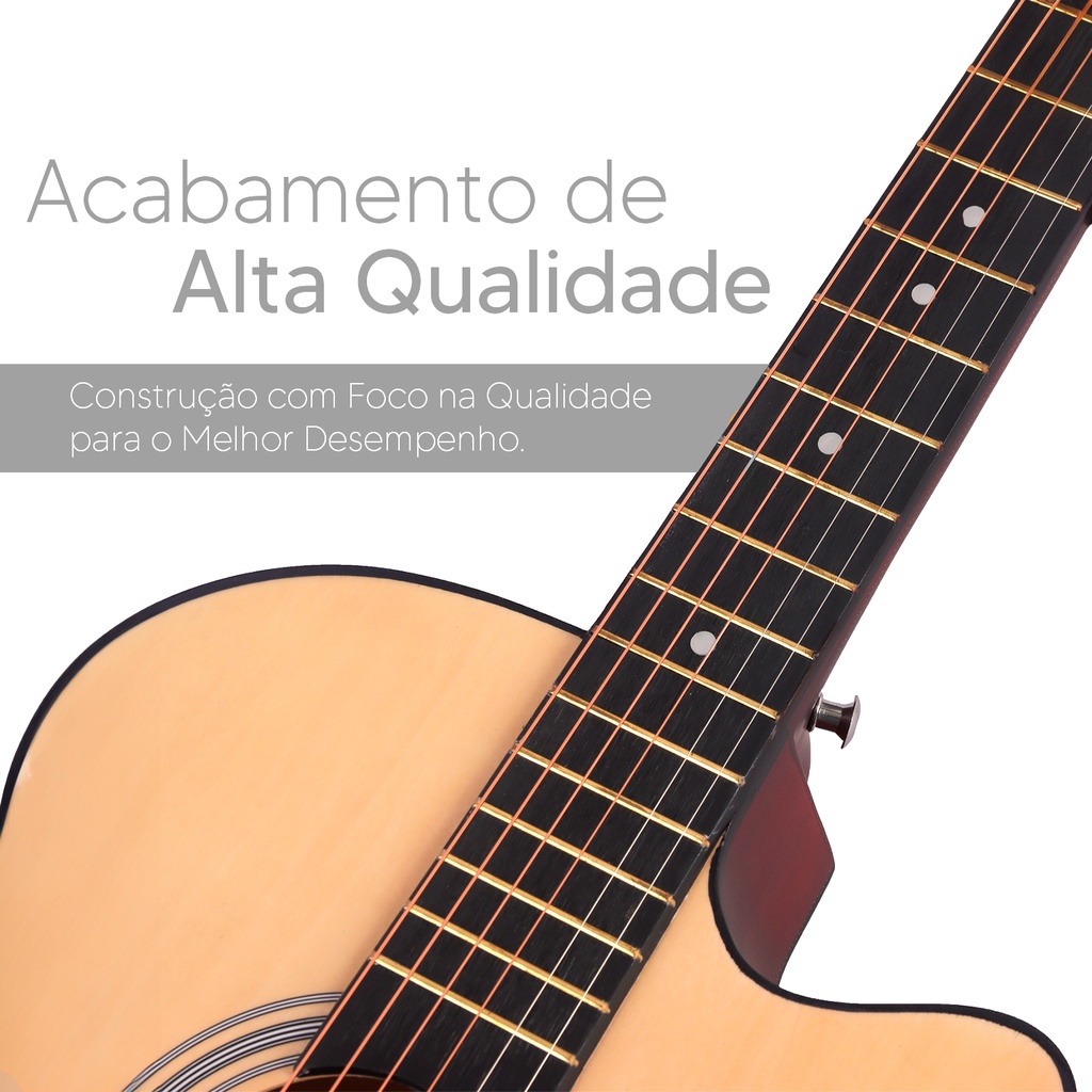Este anúncio contém: (1) Violão Clássico Acústico Aço Iniciantes Para Destros Inicie sua vida musical com este belíssimo Violão! É um modelo tradicional de 6 cordas de aço, som acústico e acabamento fosco. Características do produto: Tipo: Acústico Nível: Iniciante Cordas: 6 Escala: 19 Cavalete: 1 Quantidade de trastes: 19 Tarrachas: 6 Acabamento: Fosco Dimensões do produto: Altura: 96,5 cm Largura: 36,5 cm Profundidade: 10,9 cm Peso: 1,30 Kg Dimensões da embalagem: Altura: 12 cm Largura: 46 cm Profundidade: 98 cm Peso: 2,17 Kg Dúvidas Frequentes: 1 - Trabalhamos apenas com produtos novos, com garantia de 3 meses. 2 - Produto a pronta entrega. 3 - Seus produtos serão enviados em até 24 horas úteis após a confirmação do pagamento. Não achou o que procura? Ficou com alguma dúvida sobre o produto? Fale conosco através do campo de perguntas.