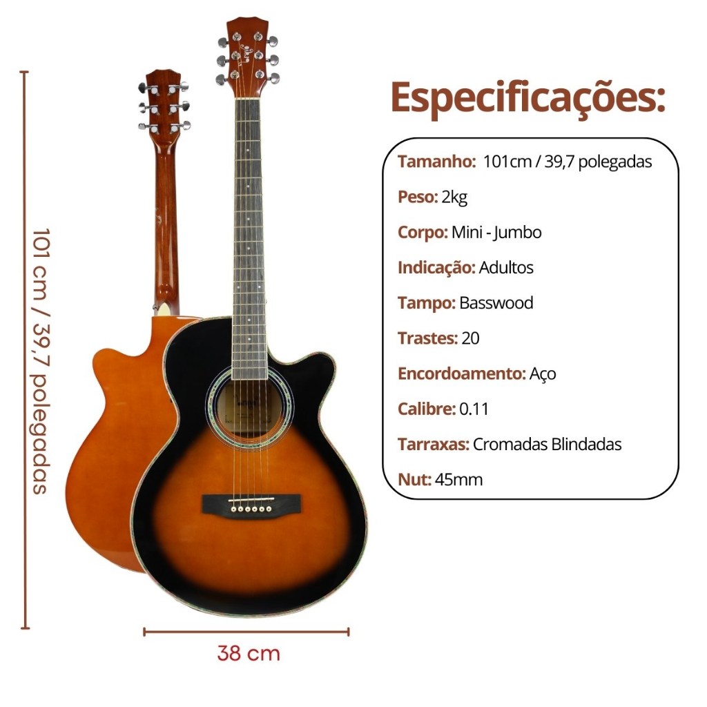 Itens inclusos: 1x Violão Elétrico Bravo Tf200 com Afinador Digital (Atenção: afinador embutido na lateral do violão) 1x Capa Violão Clássico Semi-Luxo 2x Roldanas (instaladas) O Violão Elétrico Bravo TF200 da Série Tuneful oferece som de alta qualidade com construção em Basswood e cordas de aço, proporcionando uma projeção potente. O braço de Okoume com tensor bi-direcional garante ajuste confortável e preciso, enquanto o acabamento em verniz brilhante e as opções de cores destacam o estilo deste violão elétrico. Equipado com tarraxas cromadas para afinação precisa, o produto acompanha uma capa semi-luxo acolchoada para maior proteção. Tampo: Basswood Fundo e laterais: Basswood Escala e cavalete: Madeira técnica Cordas: Aço Braço: Okoume com tensor bi-direcional Tarraxas: Cromadas Capa: Semi-luxo Acolchoada Acabamento: Verniz brilhante Encordoamento: Calibre .011 Escolha sua cor: Sunburst, Black, Red Burst, Blue Burst, Black. Headstock: Logo Bravo na cor branco Medidas: Comprimento da escala: 465 mm Largura da caixa: 380 mm Altura da caixa: 100 mm Largura do rastilho: 73 mm Largura da pestana: 43 mm Tamanho total: 102 cm Produto 100% original com garantia em todo o país.