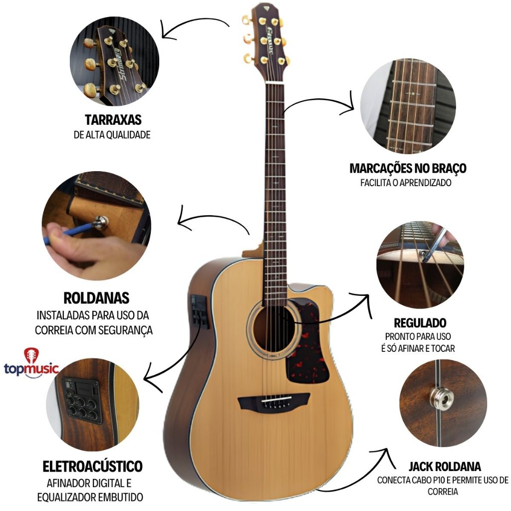 Violão Elétrico Strinberg Dd6sc Folk Aço Diamond Descubra um violão que une madeiras sólidas de alta qualidade e tecnologia de ponta. O Strinberg DD6SC Folk Diamond Series traz tampo em cedro sólido e corpo em mahogany sólido, proporcionando um timbre encorpado, equilibrado e cheio de projeção, perfeito para palcos e estúdios. Seu design Folk com cutaway garante conforto ao tocar, enquanto a escala e o cavalete em rosewood entregam suavidade e precisão na execução. As tarraxas blindadas douradas foscas com borboletas âmbar completam o visual sofisticado, trazendo estabilidade de afinação e charme único. Equipado com o poderoso pré SE-Pro, o DD6SC conta com captação piezo + microfone interno, afinador embutido e controles completos (Volume, Grave, Médio, Agudo, Phase, Notch Filter, Mic Gain e Check de bateria). Assim, você tem total controle do som em qualquer situação. Características Gerais: Modelo: DD6SC Linha: Diamond Series Formato do Corpo: Folk com Cutaway Encordoamento: Aço - D'Addario .012 Número de Cordas: 6 Madeira de Braço: Mahogany Madeira de Tampo: Cedro Sólido (Black Sunburst: Koa Sólido) Madeira da Lateral: Mahogany Sólido (Black Sunburst: Koa Laminado) Madeira de Fundo: Mahogany Sólido (Black Sunburst: Koa Laminado) Cavalete: Rosewood Escala: Rosewood Tensor: Sim. Bilateral Nut (Capo Traste): 43mm Número de Trastes: 20 Marcações: Abalone Tarraxas: Blindadas, Douradas Foscas, Borboletas âmbar Empunhadura / Mão: Destro Pré: SE-Pro Captação: Piezo / Microfone interno Alimentação:Bateria 9 volts Jack: P10 Controles do Pré: Volume, Grave, Médio, Agudo, Phase, Notch Filter, Mic. Gain, Afinador, check bateria. Itens inclusos: - 1x Violão Elétrico Strinberg Dd6sc Folk Aço Diamond - 1x Case Rígida Reforçada Produto 100% original com garantia em todo Brasil