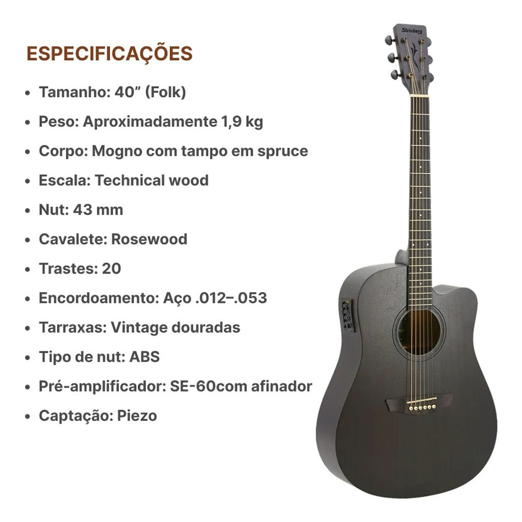 Sendo eletroacustico, e possivel obter um melhor som e aumentado ao conecta-lo a um sistema de alto-falantes. Feito a sua medida A tampa de sapele apresenta um excelente acabamento, o que lhe da uma boa projecao de som. Com suas 6 cordas voce pode tocar diferentes pecas sem se cansar, pois requer pouca pressao dos dedos. Qualidade se destaca As cordas de aco sao caracterizadas pelo seu baixo alongamento e resistencia a corrosao e a abrasao. Elas sao mais duraveis, solidas e geram um som brilhante e claro. Perfeito para voce Gracas ao seu desenho folk tem menos volume do que outros violoes, mas maior definicao. Voce podera usa-lo especialmente em estilos folk e country.