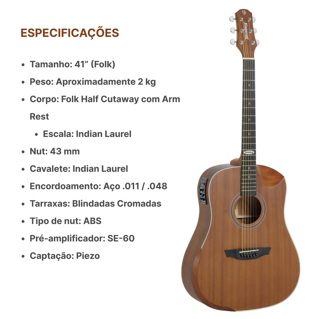 ACOMPANHA NO KIT: -BAG EXTRA LUXO STRINBERG ORIGINAL -CABO P10 P10 EMBORRACHADO -3 PALHETAS -ROLDANAS -BATERIA 9V PRONTO PARA TOCAR Violão modelo Folk Half Cutaway de belíssimo visual, excelente acabamento e ótima sonoridade. É equipado com o pré-amplificador SE-60. Acompanha Bag. Características Gerais - Modelo: SD201HC - Tipo: Violão Eletroacústico - Cor: Mahogany Satin (MGS) / Natural Satin (NS) - Acabamento: Fosco - Formato do Corpo: Folk Half Cutaway - Encordoamento: Aço .011 / .048 - Número de Cordas: 6 - Madeira de Braço: Nato - Madeira de Tampo: Sapele laminado - Madeira da Lateral: Sapele Laminado - Madeira de Fundo: Sapele Laminado - Cavalete: Indian Laurel - Escala: Indian Laurel - Tensor: Sim. Bilateral - Nut (Capo Traste): 43mm - Número de Trastes: 20 - Marcações de Escala: Dots - Tarraxas: Blindadas Cromadas - Escudo: N/A - Utilização/Mão: Destro - Pré: SE-60 - Captação: Piezo - Alimentação: Bateria 9V - Jack de Saída: P10 - Controles do Pré: Volume, Grave, Médio, Agudo, Presence, Afinador, Notch Filter, Phase e Check Bateria. Conteúdo da Embalagem: - 01 Violão / 01 Bag