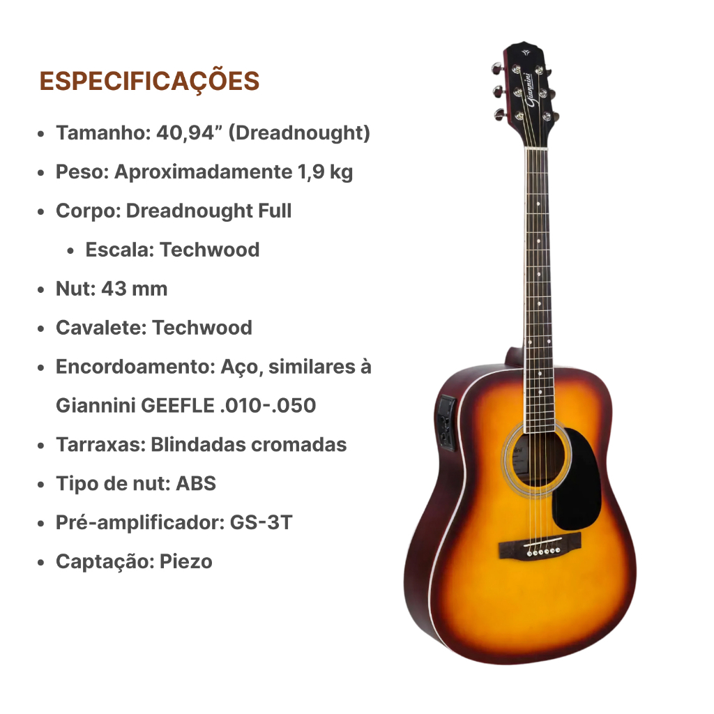 Somos a Eletromusic Loja Especializada a mais de 10 anos no Mercado. Qual é o nosso diferencial? Buscamos sempre oferecer qualidade com excelência por isso todos os nossos produtos são de Fornecedores Nacionais com rigoroso controle de qualidade, possuem nota fiscal eletrônica e garantia de fabrica. Você é bem vindo para fazer parte da nossa história Violão Aço Eletroacústico Giannini Performance GD-1 EQ Tobacco Sunburst (TS) ACOMPANHA: -01 CAPA REFORÇADA EM NYLON 600 -01 CABO DE 5 METROS -01 CORREIA -01 CAPOTRASTE -03 PALETAS Descrição: -Modelo: Violão Folk Eletroacústico com cordas de aço e braço fino e confortável -Shape Folk -Tampo: Basswood -Faixa e Fundo em Agathis -Escala em Rosewood -Braço: Okoume com tensor bi-direcional -Trastes: 21 em Alpaca -Marcação em Bolinhas: Madrepérola artificial (escala) e bolinhas pretas (lateral) -Tarraxas: Cromadas Blindadas -Captador de Rastilho K-8100 -Pré-amplificador ativo com afinador cromático embutido e Equalizador de 3 bandas -Controles: Volume, Bass, Middle, Treble, Chave Phase e Tuner -Saída: P-10 -Possui tensor: Sim -Fabricação: Fabricado na China sob supervisão da Giannini Brasil Medidas GD1EQ Folk Comprimento total: 42 Polegadas (107cm) Maior altura do corpo: 48,50cm Largura do corpo: 13cm Largura do Nut (Pestana): 4,2cm Contém: - Pré-Amplificador instalado de fábrica com afinador digital embutido - Cordas de aço originais instaladas - Bateria 9V inclusa para funcionamento do Pré-Amplificador e Afinador - Tarraxas blindadas instaladas para maior durabilidade Somos revendedores oficiais da Giannini. Produto Original com Nota Fiscal e Garantia da Giannini.