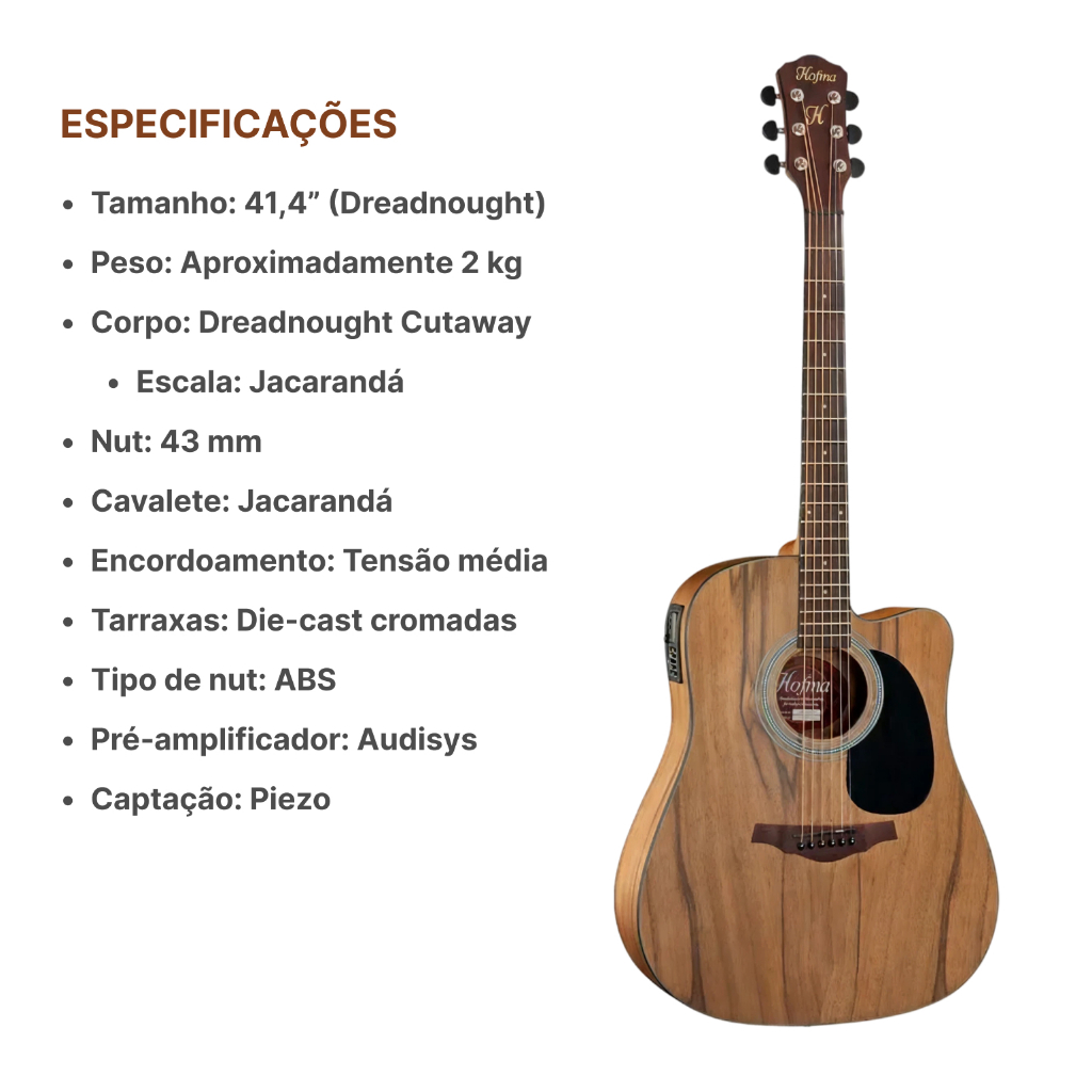 Especificações do modelo HMF 270 Tampo Dao Wood Fundo Dao Wood Laterais Dao Wood Acabamento Acetinado Roseta Mosaico Braço Mogno Oriental Tarraxas Die-cast cromadas Escala Jacarandá Cavalete Jacarandá Marcação Bolinhas brancas Trastes 20 em alpaca Sistema de Captação Piezo Cordas Aço D´Addario Padrão 0,010 Equalizador Hofma AUDISYS