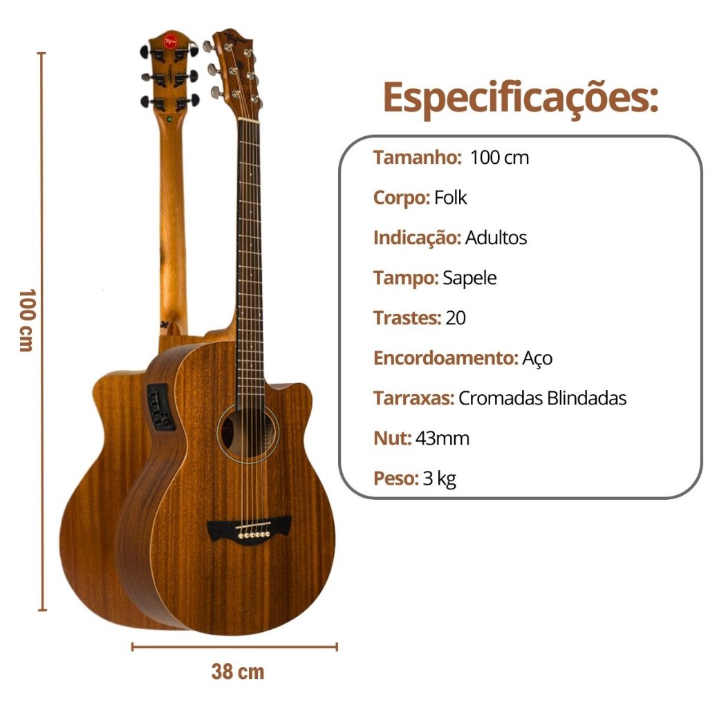 O Violão Elétrico Tagima Dallas Grand Reserva é perfeito para os amantes da música que procuram um instrumento de alta qualidade. Com um corpo em Grand Auditorium e acabamento fosco, este violão oferece um som rico e equilibrado. O tampo em Sapele e os materiais dos fundo e laterais em Agathis e Sapele garantem uma excelente ressonância. Braço: Okoume - Shape C Escala: Tech wood - C 25.5 Tampo: Sapele Lateral / Fundo: Sapele Nut: Plástico (43mm) Captação: Piezo TEQ-8 Cores: Natural mahogany satin Cavalete: Purple Heart EQ: Tagima TEQ-8 Produto 100% original, com garantia em todo Brasil.