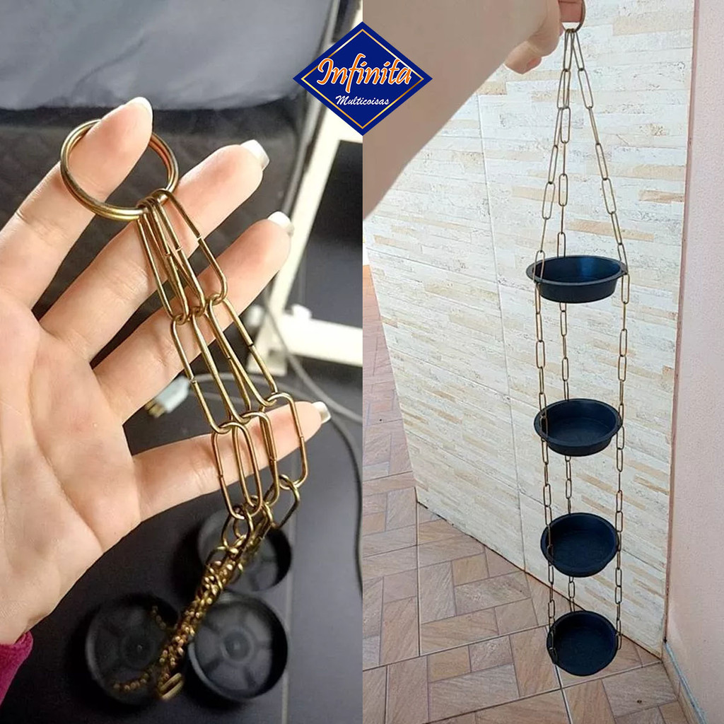 PRODUTO A PRONTA ENTREGA!! TODOS NOSSOS ENVIOS SÃO ACOMPANHADOS DA “NOTA FISCAL” TEMOS OPÇÕES DE KITS, VISITE NOSSA LOJA!! COMPRANDO KITS ECONOMIZA NO FRETE!! VIOLETEIRO COM CORRENTE DE METAL **** ATENÇÃO: Anúncio contento variações, no momento da compra atente a descrição para fazer a escolha do tamanho e cor desejada. **** **** OBS: O VIOLETEIRO É ENVIADO DESMONTADO **** Os violeteiros possuem correntes feitas de metal, sendo resistentes e práticos, agregando valor e embelezando seu espaço. São excelentes para pendurar vasos e cachepôs em varandas, garagens, pergolados, jardim de inverno, etc. As correntes são confeccionadas de arames reforçados, recebendo um tratamento resistente à corrosão causada pela umidade. Os pratinhos com 11cm de diâmetro são produzidos em plástico polipropileno de alta durabilidade,não tóxico, resistentes. QUANTIDADE - 1 unidade BENEFÍCIOS - Fácil instalação – Pode ser pendurado em ganchos, varandas ou pergolados sem necessidade de montagem complicada. - Versatilidade – Pode ser usado em áreas internas ou externas, com diversos tipos de plantas. - Durabilidade e leveza – O prato de plástico é leve e resistente, enquanto as correntes garantem firmeza. - Economia de espaço – Ideal para locais pequenos, pois permite pendurar plantas verticalmente. - Melhor exposição à luz – Ao suspender os vasos, facilita o acesso da planta à luz natural. - Organização e estética – Deixa o ambiente mais bonito, com plantas bem distribuídas e elevadas. CARACTERÍSTICAS - Produzido em metal e polipropileno - Cor: dourado, preto e prata ESPECIFICAÇÕES PRATO: - Diâmetro boca: 11cm - Diâmetro base: 8cm - Altura: 2cm 2 PRATOS - Comprimento: 44cm 3 PRATOS - Comprimento: 68cm 4 PRATOS - Comprimento: 86cm 5 PRATOS - Comprimento: 108cm Perguntas frequentes: 1. Qual o comprimento da corrente? O comprimento varia, pois temos 4 opções diferentes (2, 3, 4 ou 5 pratos) Não, mas tem demarcações de furos possibilitando fazer somente os furos necessários. 2. Qual o tamanho dos pratos? Os pratos medem 11 cm de diâmetro 3. O produto já vem montado? Não, mas é muito simples sua montagem 4. Pode ser usado com qualquer tipo de vaso? Sim, desde que o vaso caiba no prato e não ultrapasse o limite de peso. 5. É resistente à água e ao sol? Sim, tanto o plástico quanto as correntes metálicas são resistentes à umidade e à exposição solar, podendo ser usados em áreas externas. Com dúvidas? Fale conosco pelo chat, estamos a sua disposição! Visite nossa loja, temos produtos incríveis que auxiliam no dia a dia!!