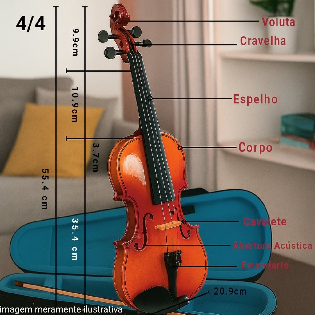 Violino Bravo Music VS44 – Leve, Completo e com Visual Brilhante O Violino Bravo Music VS44 é a escolha ideal para estudantes e iniciantes que desejam um instrumento com visual refinado, som equilibrado e excelente custo-benefício. Fabricado com madeira basswood (choupo) no tampo e fundo, proporciona leveza e boa projeção sonora para o aprendizado musical. Seu espelho em madeira branca tingida de preto oferece uma pegada confortável, enquanto as cravelhas, botão e haste do arco em ebonite garantem estabilidade e durabilidade. O estandarte em liga de alumínio completa o conjunto, mantendo as cordas bem ajustadas e facilitando a afinação. Com acabamento em verniz de resina brilhante, o VS44 tem aparência elegante e moderna. Acompanha estojo rígido moldado (form case), arco em madeira de jujuba e breu Xiao Song Xiang, prontos para você começar a tocar. Especificações Técnicas: Marca: Bravo Music Modelo: VS44 Tamanho: 4/4 (completo) Tampo e Fundo: Basswood Escala: Madeira Cravelhas e Botão: Ebonite Estandarte: Liga de alumínio Acabamento: Verniz em spray de resina, brilhante Estojo: Luxo Arco: Madeira de jujuba Breu Kit Acompanha: Estojo Rígido Arco de madeira e Crina Breu Destaques: Visual com acabamento brilhante Madeira leve com boa ressonância Ideal para estudantes e iniciantes Completo com tudo o que você precisa para começar
