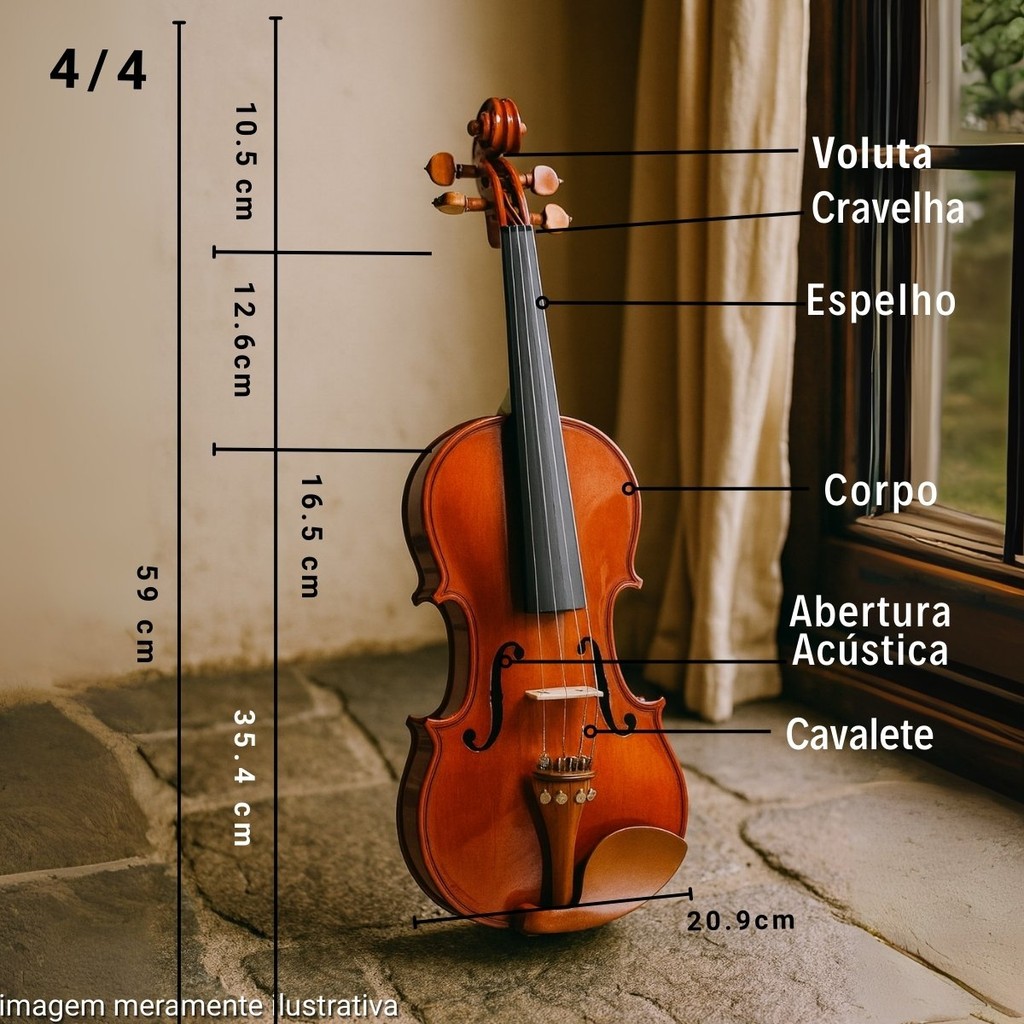 O Violino 4/4 Clássico foi desenvolvido para quem busca unir tradição, elegância e sonoridade de alto nível. Seu shape padrão clássico com tampo em pinho abeto de duplo F-Hole garante projeção sonora equilibrada, enquanto as laterais e fundo em maple oferecem ressonância e durabilidade. Cada detalhe foi cuidadosamente projetado para entregar não apenas um instrumento, mas uma verdadeira experiência musical. O espelho em ébano com 340 mm proporciona conforto e precisão na execução, ideal tanto para estudantes quanto para músicos em evolução. O cavalete em maple formato barroco potencializa a vibração das cordas, enquanto o conjunto de cravelhas, pestana, queixeira e estandarte em boxwood oferece maior estabilidade, afinação confiável e sofisticação visual. Além disso, o arco octogonal com crina animal garante resposta rápida e natural, essencial para quem deseja sensibilidade em cada nota. Com acabamento em verniz brilhante, este violino transmite imponência e requinte, sendo perfeito para apresentações, estudos e prática diária. O kit acompanha estojo de luxo, arco, cavalete e breu, oferecendo praticidade e proteção no transporte. Um produto 100% original, pronto para elevar seu desempenho musical e inspirar cada melodia tocada. Especificações : Modelo: Shape: Padrão clássico violino 4/4 Tampo: Pinho Abeto com duplo F-Hole Lateral e Fundo: Maple Braço: Maple Espelho: Ébano Comprimento do espelho: 340 mm Cavalete: Maple em formato barroco Cravelhas: Boxwood Pestana: Boxwood Largura da pestana: 25 mm Queixeira: Boxwood Estandarte: Boxwood com quatro micro-afinadores fixos Arco: Octogonal com crina animal Acabamento: Verniz brilhante Tamanho total: 60 cm Itens inclusos: Estojo luxo Arco Violino 4/4 Cavalete Breu Produto 100% original