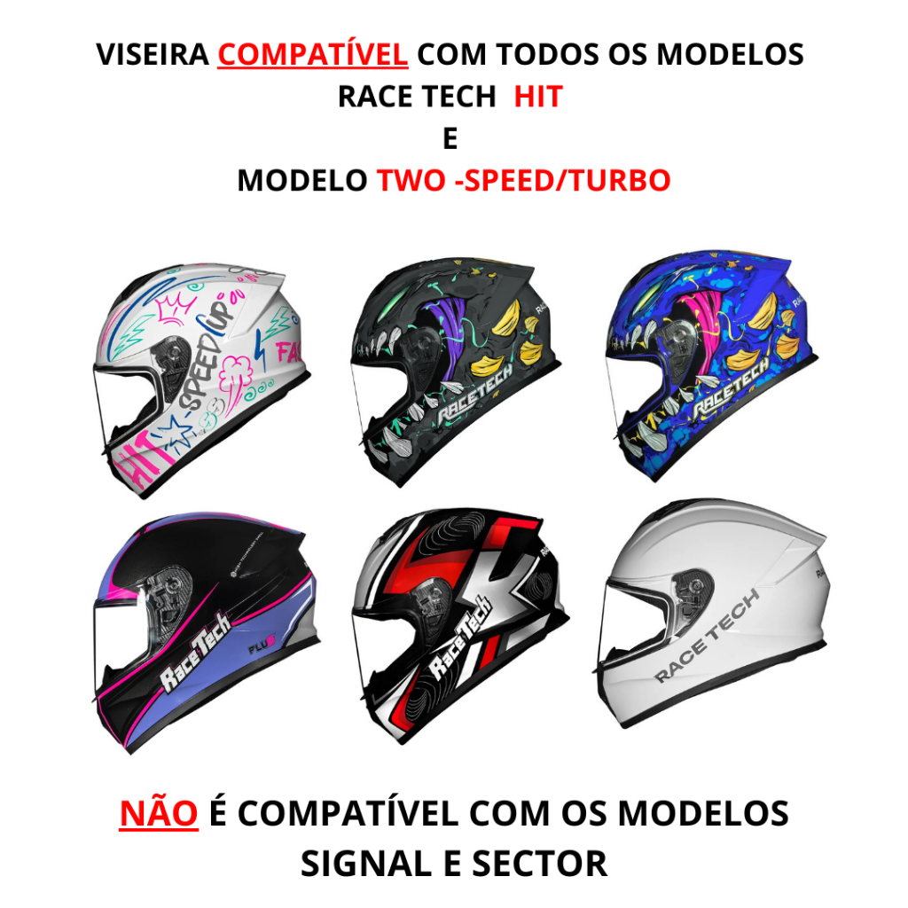 VISEIRA MARCA POLIVISOR Viseira em policarbonato tratamento anti-risco e espessura de 2,2 mm. Proteção UVA e UVB: Escudo contra raios solares nocivos. Alta Resistência Compatibilidade: Race Tech Hit TWO - Speed/Turbo