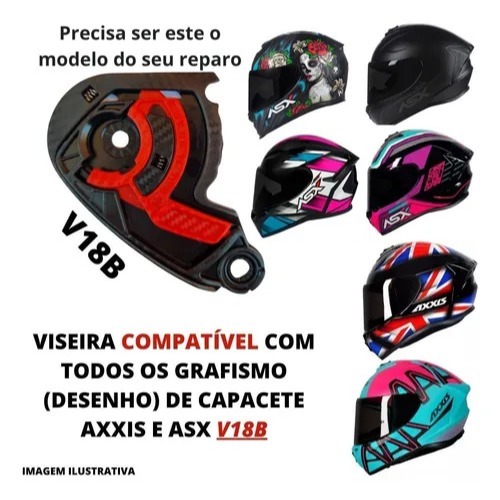 SOBRE A VISEIRA ASX / AXXIS V18B NÃO SERVE NO MODELO ASX CITY!!!!! Marca da Viseira: Polivisor Conteúdo da Embalagem: 01 Viseira Cristal Polivisor ** Imagens Meramente Ilustrativa, Não acompanha Reparo. * ATENÇÃO olhar para a foto do kit de fixação antes de comprar a viseira, pois se for o modelo antigo não irá servir. A foto do reparo neste anúncio é meramente ilustrativa (não acompanha) para auxiliar na sua compra.* Caso seu capacete seja o antigo e não encontre a viseira uma alternativa é trocar pelo reparo novo (compatível), vendindo em anúncio separadamente. Item Incluso neste anúncio: 01 Viseira FUMÊ VISEIRA V18B VISEIRA AXXIS CAPACETE DRAKEN E EAGLE FABRICADO A PARTIR DE OUTUBRO DE 2020 Características: - Compatível com Capacete Axxis Eagle E Draken; - Compatível com Capacete Axxis Eagle SV - Compatível com Capacete ASX City, Eagle e Draken - Com Tratamento Anti-Risco; - 2,2mm de espessura. Importante Não nos responsabilizamos pelo mau uso do produto. RSA Moto Peças - mais de 15 anos de experiência no ramo de moto peças.