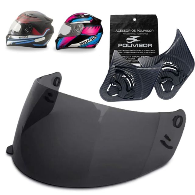 Viseira + Plate Reparo Fixador Compatível com: Capacete EBF - New Spark - EZERO X , E0X Conteúdo da Embalagem: 01 Viseira 01 Par Plate de Viseira (Direita E Esquerda) Especificações da Viseira: - Com tratamento resistente a risco. - Viseira em policarbonato com espessura de 2mm; - Viseira compatível com capacetes do tamanho 56, 58 e 60 - Super resistente- Alta transparência - Alta durabilidade - Boa vedação e funcionalidade no capacete - Proteção contra raios UV Especificações do Plate: - Padrão Original - Peça extremamente precisa que oferece total segurança durante o uso - Os produtos possuem encaixes perfeitos e não necessitam de adaptações para serem instalados. - Acessório de reposição de fácil instalação - Acompanha lado direito e esquerdo - Produto fabricado pela marca Polivisor. - Oferecendo o melhor custo beneficio, unindo qualidade e eficiência na sua utilidade. Instruções de uso: - Limpe somente com sabão neutro e água corrente - Não aplicar solvente químico, gasolina ou produtos abrasivos - Não aplicar vernizes ou adesivos - Troque sua viseira regularmente Importante: 03 Meses de garantia Não nos responsabilizamos pelo mau uso do produto