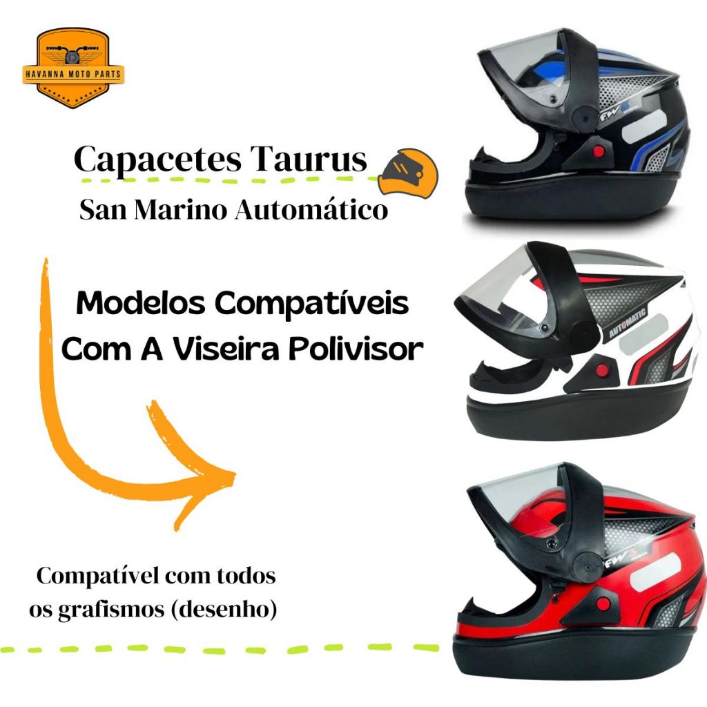 Viseira Polivisor Injetada 2.2mm Aplicação: Capacete San Marino Automático Com tratamento resistente à risco - Viseira compatível com capacetes do tamanho 56, 58 e 60 - Super-resistente - Alta transparência - Alta durabilidade - Boa vedação e funcionalidade no capacete - Proteção contra raios UV Instruções de uso: - Limpe somente com sabão neutro e água corrente - Não aplicar solvente químico, gasolina ou produtos abrasivos - Não aplicar vernizes ou adesivos - Troque sua viseira regularmente Importante: Não nos responsabilizamos pelo mau uso do produto
