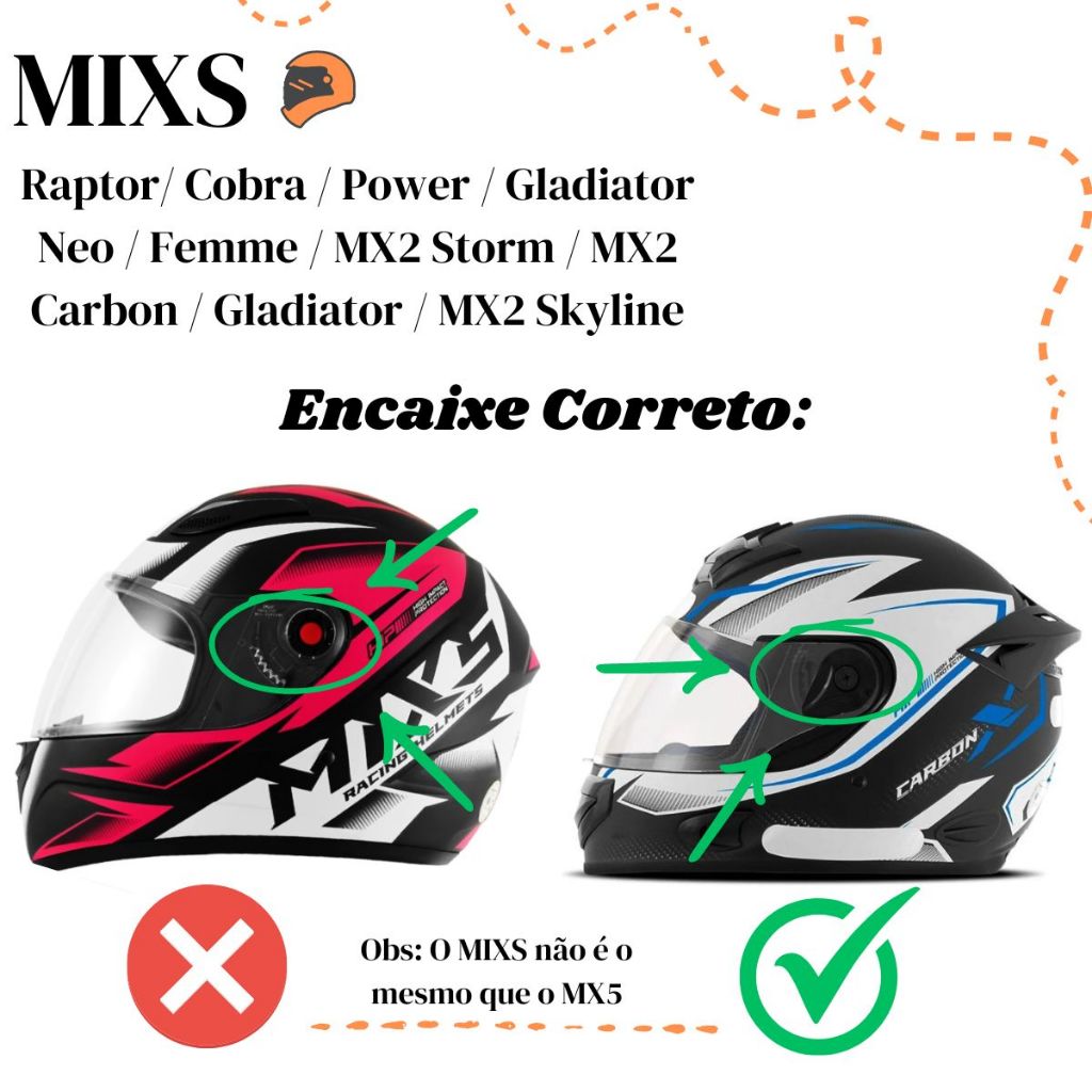 Compatível com: Capacete Mixs: - Mixs Raptor - Mixs Cobra - Mixs Power - Mixs Gladiator Neo - Mixs Femme - Mixs MX2 Storm - Mixs MX2 Carbon - Mixs Gladiator - Mixs MX2 Skyline Informações: - Com tratamento resistente a risco - Viseira em policarbonato com espessura de 2.2mm; - Viseira compatível com capacetes do tamanho 56, 58 e 60 - Super resistente - Alta transparência- Alta durabilidade - Boa vedação e funcionalidade no capacete - Proteção contra raios UV - Fácil Instalação Com mais de 20 anos de experiência no mercado a Polivisor é maior fabricante de viseiras para capacetes no Brasil. Produzindo viseiras de alta qualidade, com investimentos constantes em tecnologia para o desenvolvimento de novo produtos. Instruções de uso: - Limpe somente com sabão neutro e água corrente - Não aplicar solvente químico, gasolina ou produtos abrasivos - Não aplicar vernizes ou adesivos - Troque sua viseira regularmente Importante: - Não nos responsabilizamos pelo mau uso do produto
