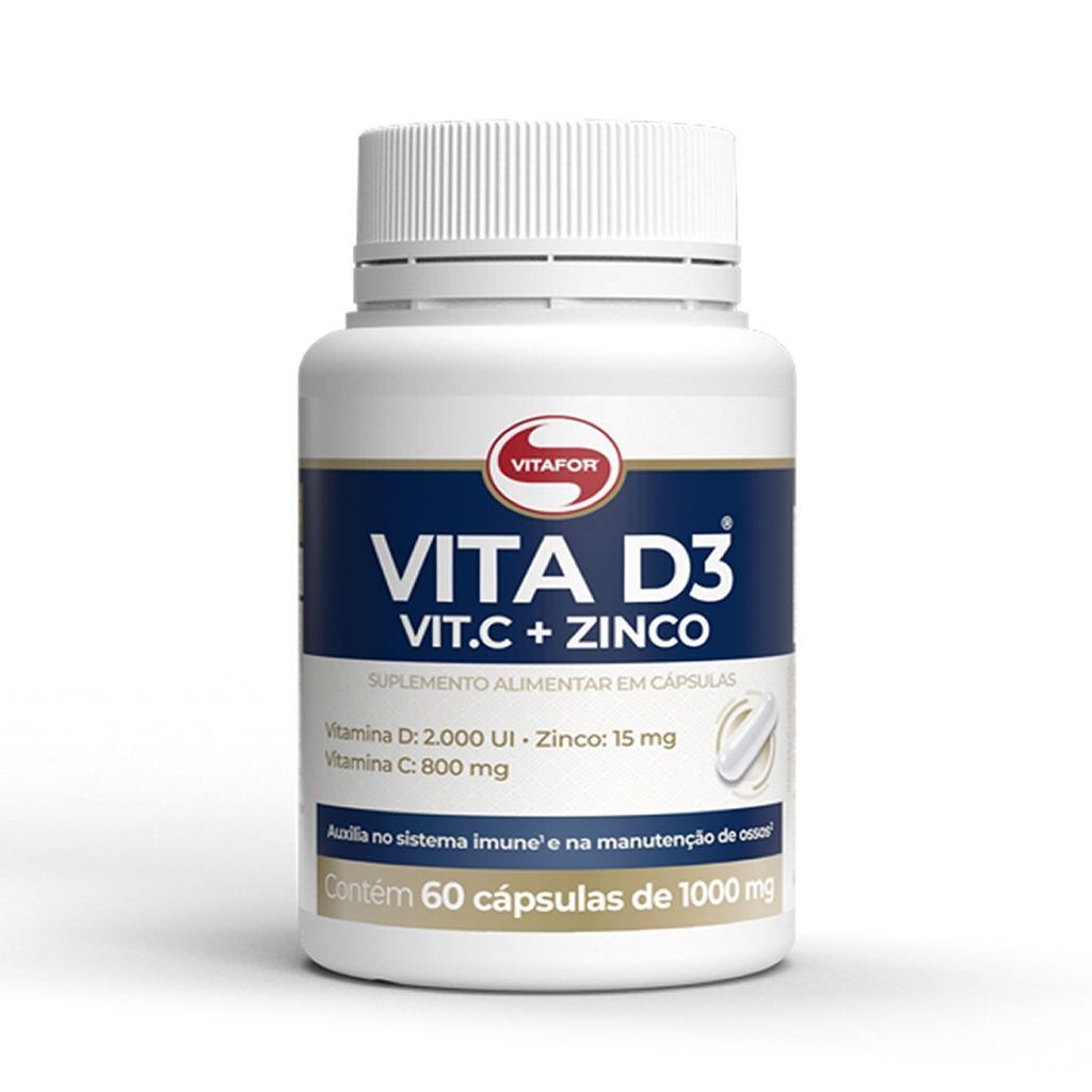 VITA D3® Vit. C + Zinco é um suplemento alimentar que combina três nutrientes importantes para o fortalecimento do sistema imunológico, vitamina D, C e zinco. A formulação da Vitafor além de trazer vitamina D em alta concentração, fornece vitamina C e zinco, reforçando os benefícios para o sistema imunológico e ossos. Como Tomar Ingerir 1,13g (1 cápsula) ao dia ou seguir a recomendação de um profissional da saúde. Ingredientes Ácido ascórbico (vitamina C), bisglicinato de zinco (zinco), colecalciferol (vitamina D), antiumectantes: Estearato de magnésio e dióxido de silício e agente de massa celulose microcristalina. Composição da cápsula: Gelatina, polietilenoglicol (PEG) e corante natural dióxido de titânio. NÃO CONTÉM GLÚTEN. ...