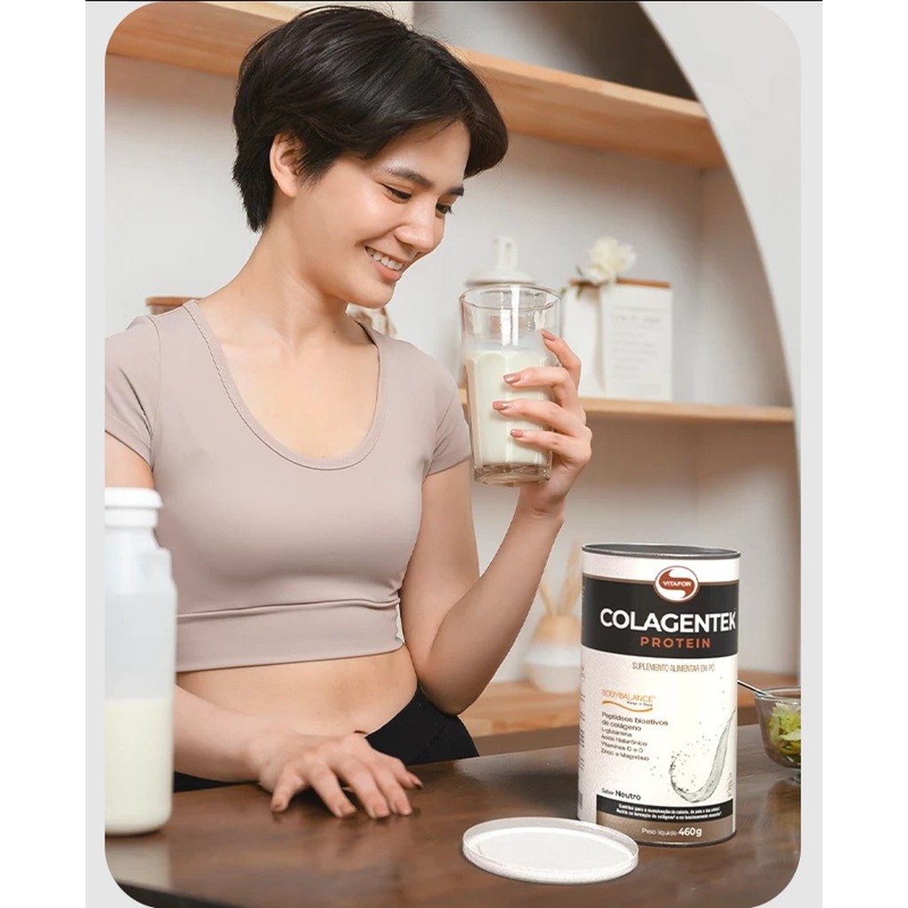 Vitafor Colagentek Protein Bodybalance Neutro 460g Benefícios: A vitamina D e o magnésio auxiliam no funcionamento muscular e na formação de ossos e dentes³; A vitamina D auxilia na absorção de cálcio e fósforo e na manutenção de níveis de cálcio no sangue; A vitamina C auxilia na absorção de ferro dos alimentos, na formação de colágeno², na regeneração da forma reduzida da vitamina E e no metabolismo de proteínas e gorduras; A vitamina C e o zinco são antioxidantes que auxiliam na proteção dos danos causados pelos radicais livres; A vitamina C, D e o zinco auxiliam no funcionamento do sistema imune; A vitamina C e o magnésio auxiliam no metabolismo energético; O magnésio auxilia no equilíbrio dos eletrólitos e no funcionamento neuromuscular; O magnésio e o zinco auxiliam no metabolismo de proteínas carboidratos e gorduras e no processo de divisão celular; O zinco auxilia na visão, no metabolismo da vitamina A, na síntese de proteínas e na manutenção de ossos; O zinco contribui para a manutenção do cabelo, da pele e das unhas¹. Diferenciais: 14g de proteína por porção; Peptídeos bioativos de colágeno - tecnologia alemã Bodybalance®; 100mg de ácido hialurônico por porção; 5g de glutamina por porção; Contém BCAAs naturalmente presentes na formulação; Fonte de vitaminas D e C, magnésio e zinco; Pode ser consumido por pessoas que possuem restrição ao consumo de proteínas do leite ou vegetais; Pode ser consumido quente ou frio; Versatilidade na versão neutra - pode ser utilizado em diversas preparações, além das versões: morango, tangerina e cacau. Como consumir? Dissolva 20 g (1 colher medida) em 100 mL de água ou na sua bebida favorita e misture até total homogeneização. Beba imediatamente após o preparo. Recomendação de uso : Suplemento alimentar de uso adulto (a partir de 19 anos de idade): ingerir 20 g (1 colher medida) ao dia ou seguir a recomendação de um profissional da saúde. Dados científicos Os músculos são essenciais para tudo o que se faz no dia a dia. Desde manter a postura, andar, realizar movimentos simples como digitar... são peças fundamentais para manter o organismo em funcionamento¹. Mas, para que funcionem da forma certa, é preciso manter a saúde muscular em dia. Não é segredo que, para isso, é recomendado a prática de atividades físicas regularmente e uma alimentação equilibrada. Além disso, a suplementação pode ser uma grande aliada². A tecnologia BODYBALANCE® se mostrou eficiente não só no ganho de massa muscular, mas também podendo auxiliar no processo de perda de gordura2. Essa tecnologia consiste na proteína derivada do colágeno hidrolisado, com comprovação clínica e científica associando diversos benefícios³. Além do colágeno hidrolisado, COLAGENTEK® PROTEIN conta com glutamina, ácido hialurônico, vitaminas C e D, magnésio e zinco. Adicione à sua rotina uma opção prática e saborosa!