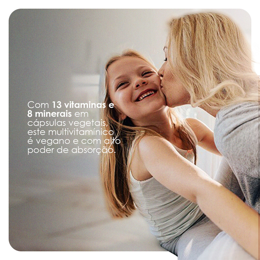 INFORMAÇÕES DE DESTAQUE Com 13 vitaminas Com 8 minerais Alto poder de absorção Cápsulas vegetais Vegano DESCRIÇÃO Com uma combinação de 13 vitaminas e 8 minerais, este multivitamínico em cápsulas vegetais é uma opção prática para atender às necessidades diárias de nutrientes. Vegano e com alta absorção, oferece suporte nutricional para quem busca manter uma rotina saudável e equilibrada. COMPOSIÇÃO Ingredientes: Blend de vitaminas e minerais (bisglicinato de magnésio, ácido ascórbico revestido, bisglicinato de zinco, mix de tocoferóis, betacaroteno, nicotinamida, pantotenato de cálcio, menaquinona-7, fitomenadiona, bisglicinato de cobre, L-selenometionina, bisglicinato de manganês, colecalciferol [vegano], cloridrato de tiamina, riboflavina-5-fosfato, piridoxal-5-fosfato, acetato de retinol, picolinato de cromo, molibdato de sódio, L-metilfolato de cálcio, iodeto de potássio, biotina, metilcobalamina), estabilizante celulose microcristalina, antiumectante dióxido de silício. Composição da cápsula vegetal: Água purificada, espessantes hidroxipropilmetilcelulose e carragena, corante inorgânico dióxido de titânio. Alérgicos: Não contém glúten. SUGESTÃO DE USO Ingerir 1 cápsula ao dia com uma refeição, ou conforme orientação de médico ou nutricionista. Armazenamento: Manter o produto bem fechado, em local fresco, seco e ao abrigo da luz solar. Validade após aberto: Consumir em até 90 dias. Indicação: Este produto é recomendado para adultos (=19 anos). ADVERTÊNCIAS "Este produto não é um medicamento." "Não exceder a recomendação diária de consumo indicada na embalagem." "Mantenha fora do alcance de crianças."