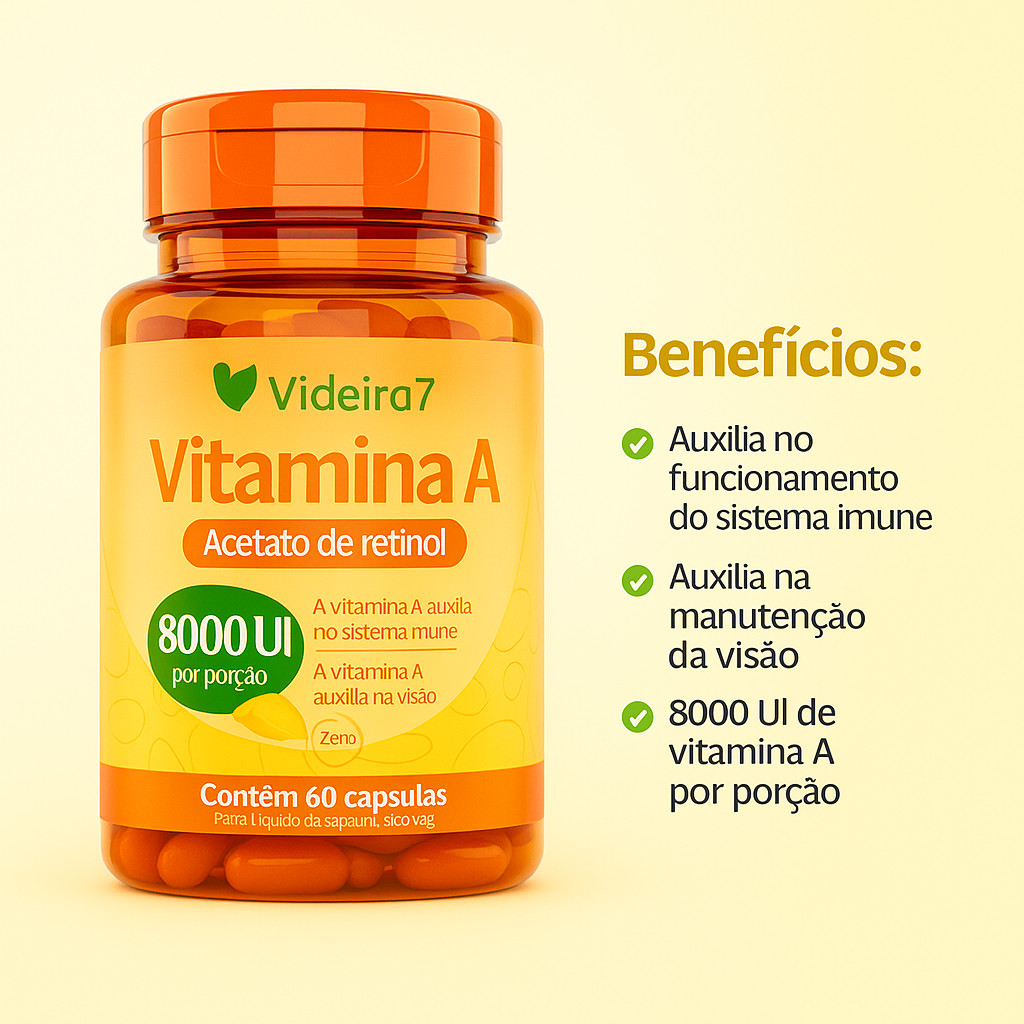 A vitamina A auxilia na visão. A vitamina A auxilia no funcionamento do sistema imune A vitamina A auxilia no metabolismo do ferro. A vitamina A contribui para a manutenção da pele. A vitamina A auxilia na manutenção de mucosas. A vitamina A auxilia no processo de diferenciação celular Contém 60 capsulas Recomendações de Uso: 2 capsulas ao dia Ingredientes: Acetato de retinol, Amido modificado, Antiumectante dióxido de silício INS 551. Composição da capsula: Gelatina, umectante glicerina INS 422 e água purificada. NÃO CONTEM GLUTEN Precauções “Esse produto não é medicamento” “Não exceder a recomendação de uso diária de consumo indicada na embalagem” “Manter fora do alcance de crianças”