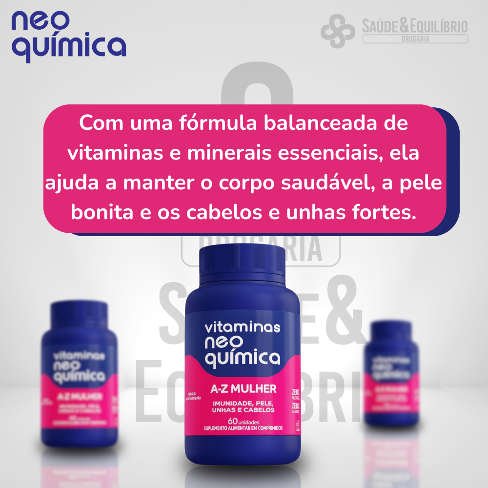 A Vitamina A-Z Mulher é um suplemento alimentar completo desenvolvido especialmente para o cuidado da saúde feminina. Com uma fórmula balanceada de vitaminas e minerais essenciais, ela ajuda a manter o corpo saudável, a pele bonita e os cabelos e unhas fortes. Benefícios: Fortalece o sistema imunológico Melhora a saúde da pele, cabelos e unhas Aumenta a disposição e energia diária Auxilia no equilíbrio hormonal feminino Contém vitaminas A, C, D, E, B6, B12, Biotina, Zinco e Ferro Diferenciais: Zero açúcar e zero calorias Contém 60 comprimidos (suplemento para 2 meses de uso) Ideal para mulheres que buscam mais vitalidade e beleza Modo de uso: Ingerir 1 comprimido ao dia. ESTE PRODUTO NÃO É UM MEDICAMENTO!!!!