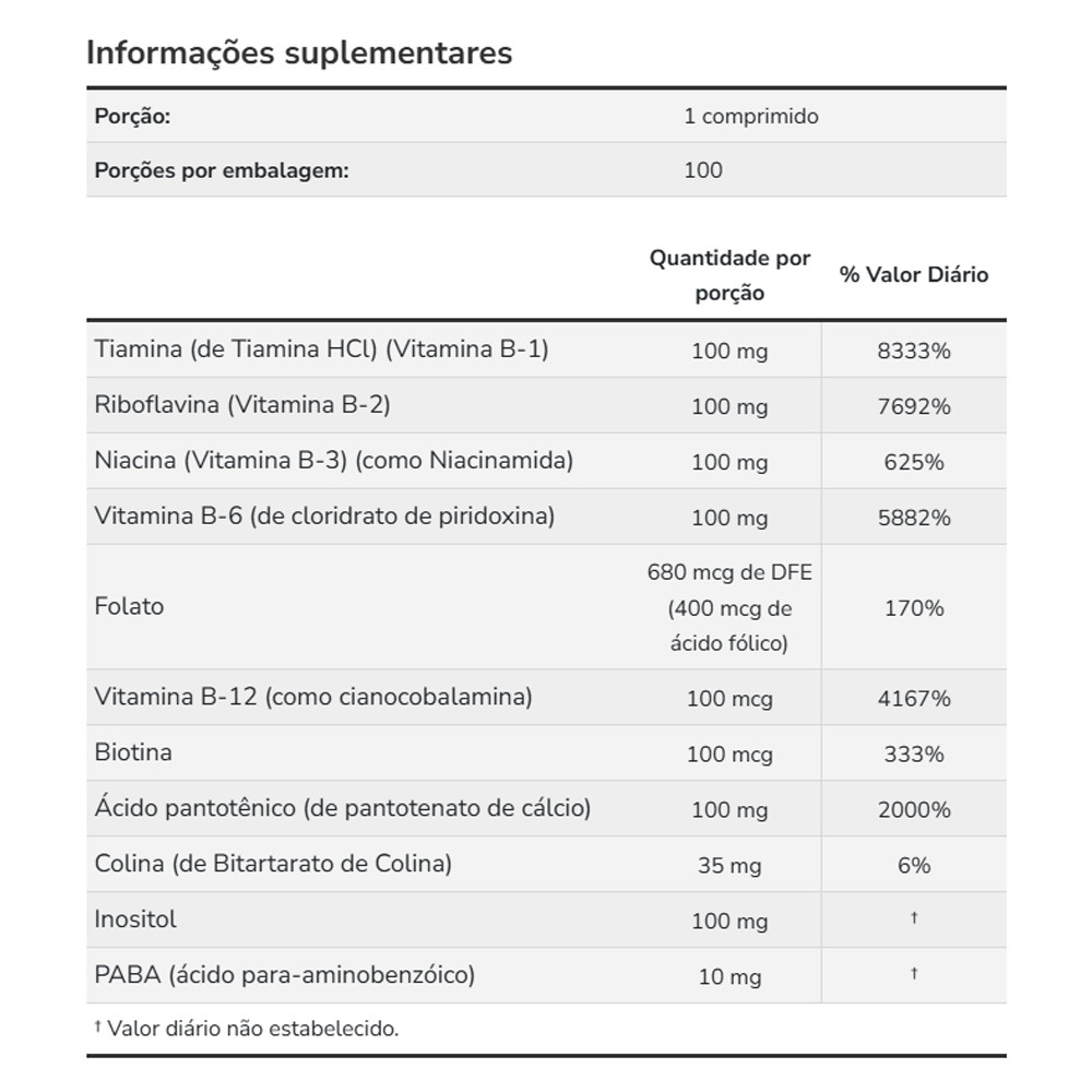 Vitamina B-100 Now Foods 100 Tablets Importado 1. O que é a Vitamina B-100 Now Foods? Vitamina B-100 Now Foods é um suplemento importado que contém um complexo completo de vitaminas B em cada tablet. Ele oferece uma alta dose de 100mg por porção, promovendo bem-estar e energia ao corpo. 2. Por que escolher a Vitamina B-100 Now Foods? Este suplemento é ideal para quem deseja complementar sua dieta com vitaminas do complexo B. Ele fornece uma quantidade significativa de nutrientes essenciais que ajudam a melhorar a disposição e o desempenho físico. 3. Benefícios das Vitaminas B para o corpo As vitaminas do complexo B são essenciais para o bom funcionamento do organismo, auxiliando no aumento da energia, metabolismo eficiente e no apoio às funções cognitivas e ao equilíbrio do sistema nervoso. 4. Como a Vitamina B-100 Now Foods age no corpo? A Vitamina B-100 Now Foods auxilia no metabolismo de carboidratos, gorduras e proteínas, além de melhorar a produção de energia, promovendo um aumento de disposição e suportando funções importantes do corpo. 5. Praticidade e qualidade da Vitamina B-100 Now Foods Cada frasco contém 100 tablets de Vitamina B-100, proporcionando uma excelente durabilidade de uso. A embalagem prática é ideal para quem busca um suplemento de alta qualidade e potência para o dia a dia. Validade longa
