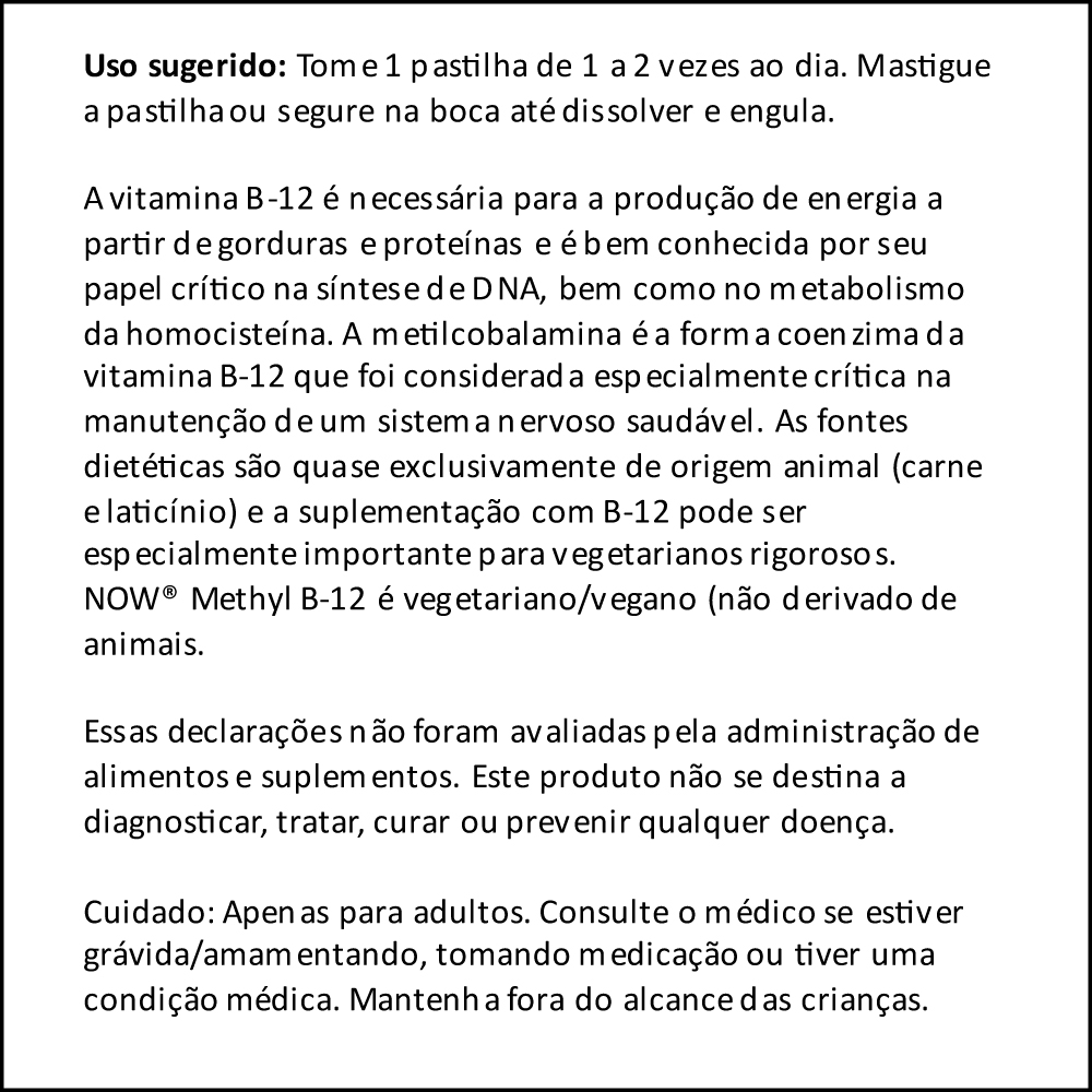 Vitamina B-12 1mg com Metilcobalamina Now 100 Past Produto Importado Original 1. Suporte Eficiente: A Vitamina B-12 da Now com Metilcobalamina é projetada para oferecer um suporte eficiente. Esta forma de vitamina B-12 é reconhecida por sua absorção e utilização eficazes pelo corpo, proporcionando uma maneira efetiva de complementar sua rotina. 2. Pastilhas Práticas: Contendo 100 pastilhas, esta apresentação é extremamente prática. As pastilhas são fáceis de consumir e oferecem uma maneira conveniente de incluir a Vitamina B-12 em sua rotina diária, sem a necessidade de água para ingestão. 3. Produto Importado de Pronta Entrega: Este suplemento é importado, assegurando uma alta qualidade e padrões internacionais. Além disso, sua disponibilidade para pronta entrega permite que você inicie seu uso sem demora. 4. Fácil Integração na Rotina: As pastilhas de Vitamina B-12 são ideais para uma integração fácil e rápida em qualquer rotina. Seu formato facilita o consumo, podendo ser tomadas a qualquer hora do dia, sem complicação ou necessidade de preparo especial. 5. Composição Destacada: Cada pastilha contém 1mg de Metilcobalamina, uma forma ativa e eficiente de Vitamina B-12. Esta composição é cuidadosamente selecionada para garantir uma formulação de alta qualidade, sem aditivos desnecessários. VALIDADE LONGA