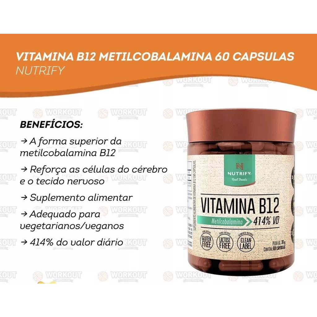 Vitamina b12 (60 caps) - nutrify a vitamina b12 da nutrify é um suplemento alimentar de vitamina b12 em sua forma natural, a metilcobalamina. A vitamina b12 é importante para o bom funcionamento de diversos processos em nosso organismo, entre eles: a formação de células vermelhas do sangue e o funcionamento do sistema imune. benefícios cada dose fornece 414% da indicação diária de vitamina b12 para adultos saudáveis; ideal para vegetarianos e veganos; não contém glúten. embalagem disponível: frasco contendo 60 cápsulas de suplemento. . Informações importantes Indicações Não Ingredientes Vitamina B12 (metilcobalamina), estabilizante celulose microcristalina e cápsula verde: (estabilizante hidroxipropilmetilcelulose e corante clorofilina cúprica).