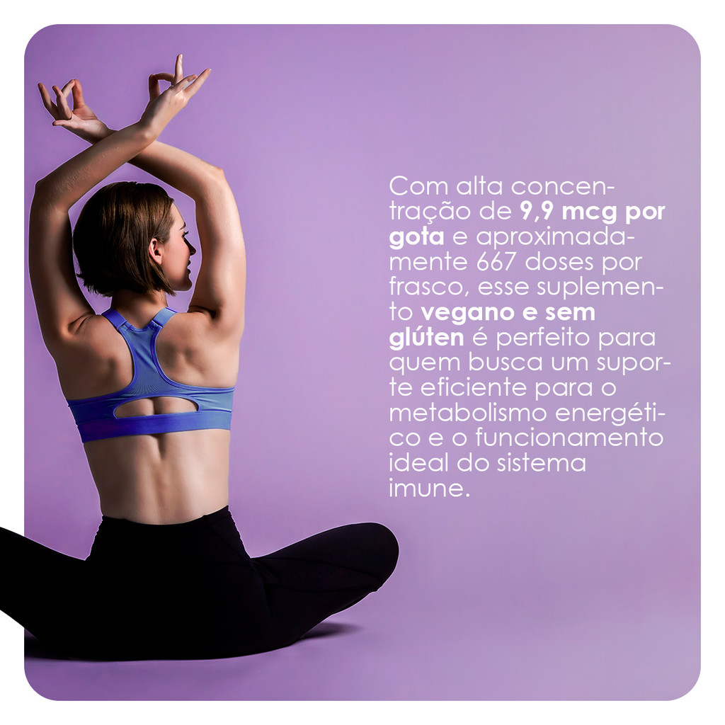 INFORMAÇÕES DE DESTAQUE • Rápida Absorção • Sabor Menta • Vitamina B12 por Gotas • Produto Vegano DESCRIÇÃO Vitamina B12® Vitafor contém metilcobalamina, uma forma ativa da vitamina B12. Cada gota (0,036 g) fornece 9,9 mcg de vitamina B12. INGREDIENTES Água purificada, blend de vitamina [maltodextrina** e metilcobalamina (vitamina B12)], espessante glicerina, antioxidante ácido cítrico e aroma natural. (**) Fornece quantidades não significativas de açúcares. NÃO CONTÉM GLÚTEN. MODO DE USO Consumir conforme recomendação de um profissional de saúde. ADVERTÊNCIAS • Este produto não deve ser consumido por gestantes, lactantes e crianças sem orientação médica. • O consumo deve estar associado a uma alimentação equilibrada e hábitos de vida saudáveis.