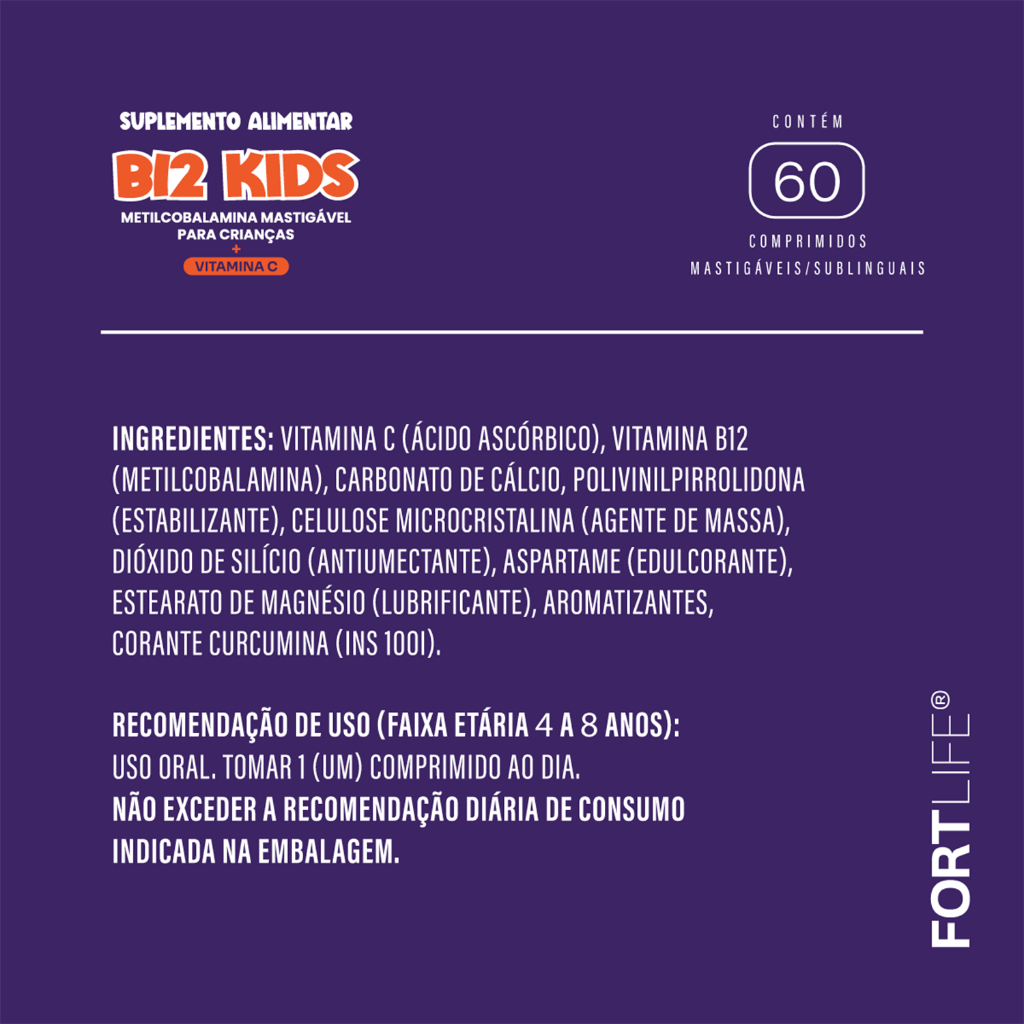Vitamina B12 Kids Meticolamina + Vitamina C - 280mg 60 Comprimidos Mastigáveis - FORTLIFE Desperte o Super-Herói em Seu Filho com B12 KIDS da FORTLIFE Imagine um mundo onde seu pequeno herói está sempre pronto para novas aventuras, com energia e uma saúde vibrante! Pensando nisso, a FORTLIFE traz até você o B12 KIDS, especialmente formulado para cuidar do futuro dos seus filhos. Combinando a força da Metilcobalamina e o poder antioxidante da Vitamina C, os comprimidos mastigáveis de B12 Kids, não são apenas vitaminas; são escudos diários de proteção. Metilcobalamina: Esta forma natural de vitamina B12 é essencial para: - Formação de Células Sanguíneas Saudáveis: Apoia a saúde do sangue, fundamental para um crescimento equilibrado e vigoroso. - Estímulo à Memória e ao Foco no Aprendizado: Ajuda suas crianças a terem um melhor desempenho escolar, lembrando-se das lições e focando melhor nas atividades. - Mais Energia para Atividades Diárias: Assegura que seus pequenos guerreiros mantenham a vitalidade necessária para enfrentar o dia, cheios de disposição. Vitamina C: Conhecida por sua capacidade de fortalecer o sistema imunológico, atua como a aliada perfeita contra resfriados e infecções, garantindo que nada atrapalhe as brincadeiras dos seus pequenos. E sabe o melhor? Estes comprimidos têm sabor de deliciosas Frutas Roxas, transformando a experiência das vitaminas em momentos divertidos e agradáveis! Você deseja um futuro próspero e saudável para seus filhos. Com B12 KIDS, eles não apenas recebem as vitaminas necessárias para crescer fortes e saudáveis, mas também desenvolvem bons hábitos de saúde desde cedo, que durarão toda a vida. Faça das vitaminas algo que os seus filhos esperem impacientemente todos os dias! Não deixe passar esta chance de investir no bem-estar dos seus pequenos! Adquira agora e transforme a saúde dos seus filhos hoje mesmo com B12 KIDS da FORTLIFE! Veja a diferença na qualidade de vida e energia dos seus filhos! B12 KIDS da FORTLIFE: Porque cada pequeno detalhe no presente constrói um futuro brilhante. RECOMENDAÇÕES DE USO (A partir de 4 Anos): Uso oral 1x (uma vez) ao dia.
