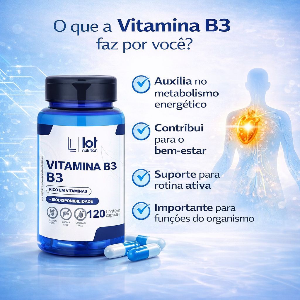 💊 Vitamina B3 (Niacina) 120 Cápsulas – Circulação, Pele e Sistema Nervoso | Lot Nutrition A Vitamina B3 (Niacina) da Lot Nutrition é um suplemento alimentar essencial para quem busca suporte ao metabolismo, saúde da pele e funcionamento do sistema nervoso. A niacina contribui para a produção de energia a partir dos alimentos, auxilia na circulação sanguínea e apoia a saúde da pele e do sistema nervoso, promovendo bem-estar geral no dia a dia. ✨ Benefícios ✔ Auxilia no metabolismo energético ✔ Contribui para circulação sanguínea saudável ✔ Apoio à saúde da pele ✔ Suporte ao sistema nervoso ✔ Suplementação diária de vitamina B3 💊 Informações do Produto Marca: Lot Nutrition Quantidade: 120 cápsulas Uso adulto Suplemento alimentar 🎯 Indicado para: Pessoas que buscam suporte ao metabolismo Rotina de cuidados com a pele Saúde do sistema nervoso Complementação diária de vitaminas do complexo B 📌 Como usar Consumir conforme orientação de profissional da saúde ou conforme indicado na embalagem. ⚠️ Importante Este produto não é medicamento. Não exceder a recomendação diária indicada na embalagem. Gestantes, lactantes e pessoas com condições médicas devem consultar um profissional de saúde antes de consumir.
